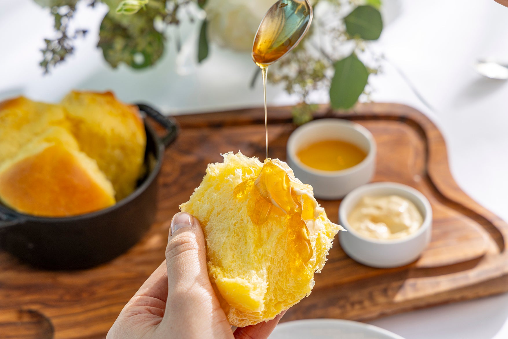 思わず笑顔がこぼれる料理を届けたいというシェフの想いから、店内で焼いた特大サイズのブリオッシュをご提供いたします。リニューアルを飾る新たなシグネチャーメニューとして試行錯誤を重ね、焼き立ての芳醇な香りとふわふわの食感が合わさり、高揚感溢れるひとときを演出します。付け合わせには、シェフおすすめのキャラメリゼした北海道産バターを泡立たせた香ばしい風味が魅力の自家製焦がしホイップバターに加え、蜂蜜と季節のフレーバーソースの3種類をご用意。2名様で一つシェアしていただく大きなブリオッシュで、大切な方と心温まる時間をお楽しみください。