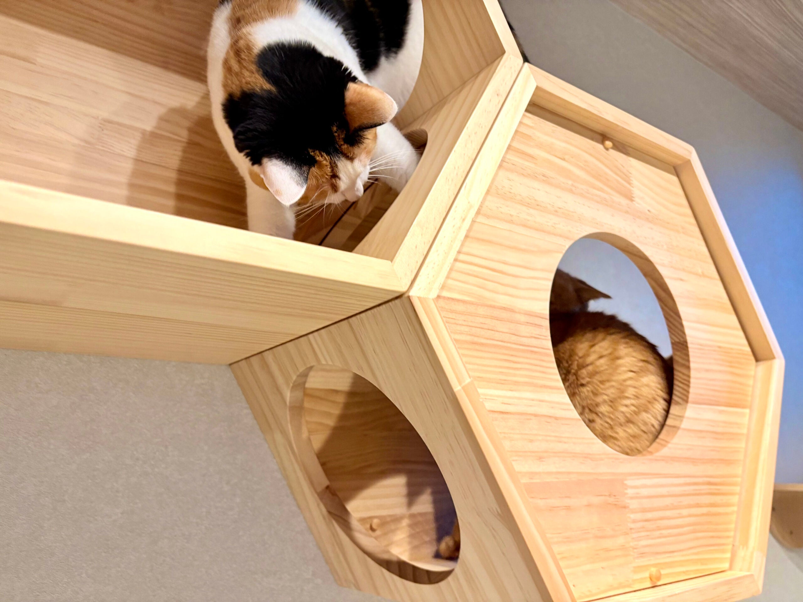 キャットステップやキャットタワーだけなく人間用のソファも配置するなど、猫が自宅に近い雰囲気を感じ取り安心できるよう、空間づくりにこだわり抜きました。窓ガラスは断熱性の高いトリプルガラスを採用して寒暖差のストレスを抑える設計により、エアコンが苦手な猫でも快適に過ごせるよう工夫がされています。