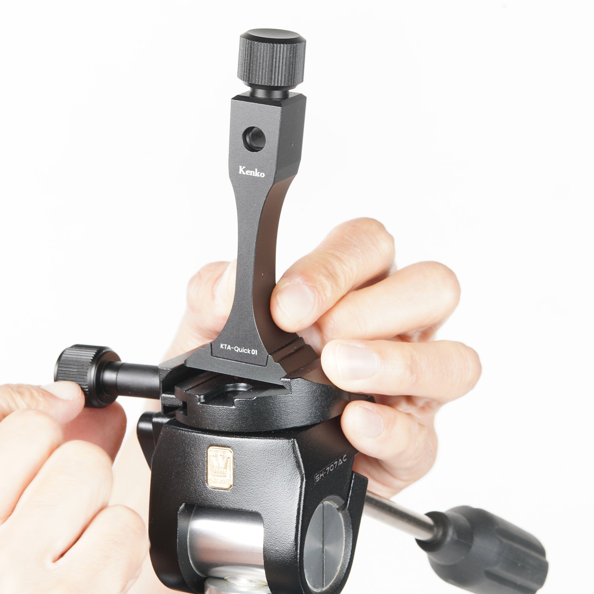 雲台のクイックシュー取付部はアルカスイス互換のため、付属のクイックシュープレートのほか、KTA-Quick01 三脚ホルダーなど、アルカスイス互換に対応するアクセサリーが取り付け可能です。
