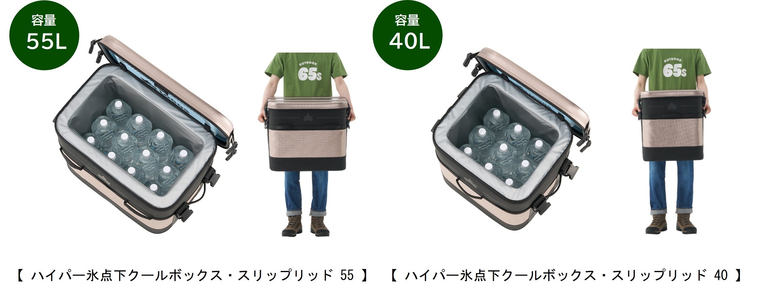 「ハイパー氷点下クールボックス・スリップリッド 55」は、約55Lの容量を確保し、2Lペットボトルを縦に12本と、別売りの氷点下パックXL(1200g)を4枚収納可能。「ハイパー氷点下クールボックス・スリップリッド 40」は、約40Lの容量を確保し、2Lペットボトルを縦に9本と、別売りの保冷剤氷点下パックL(900g)を4枚収納可能。