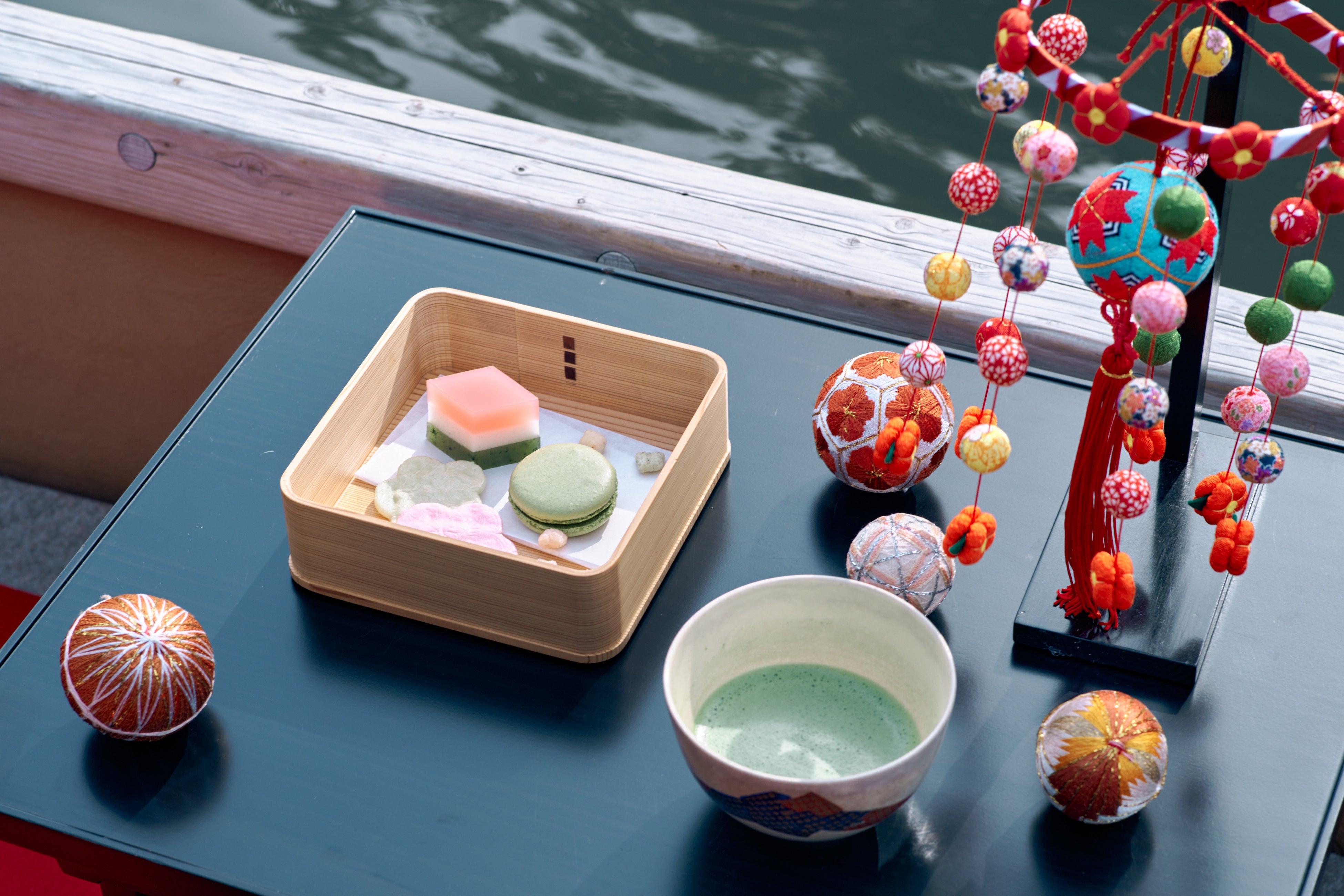 抹茶とともに味わえるのは、立花家御用達の「吉蔵」の菱形羊羹、花せんべい、雛あられなどの甘味です。春の陽気と水面のきらめきに包まれながら、柳川ならではの川下りをゆったりお楽しみいただけます。