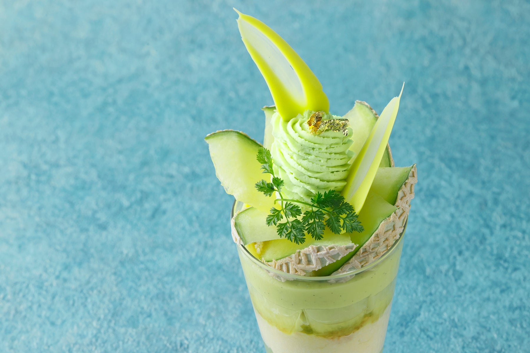 さらに、スポンジにメロンのカスタードクリームを合わせ、トップには甘み豊かな国産マスクメロンと金箔を贅沢にあしらいました。果実本来のみずみずしさと上品な甘みを存分に堪能できる、春の午後に彩りを添えるご褒美パフェです。