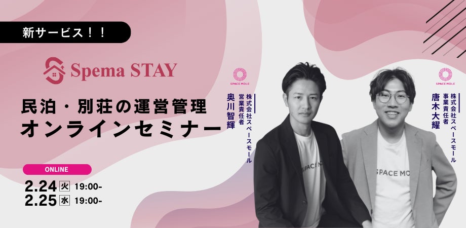 「SpemaSTAY/スペマステイ」の提供開始に伴い、無人宿泊事業の最新動向や運営手法を解説するオンラインセミナーを開催いたします。 本セミナーでは、スペースモールの事業責任者および営業責任者が登壇し、レンタルスペースと宿泊を組み合わせた「複合運用」の具体的な仕組みや、収益安定化に向けた事例、コンプライアンスを遵守した運営体制の構築方法についてお伝えいたします。