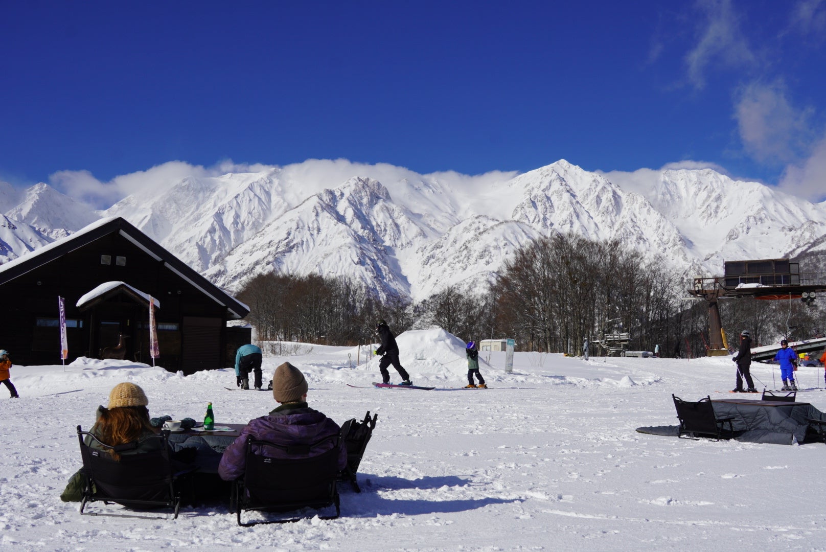 白馬八方尾根の雄大な北アルプスの絶景を目の前に望むことができる絶景スポット。北尾根高原エリアでは雪原の中のこたつで暖まるこたつカフェや、うさぎ平OAKLEY TERRACEではDJイベントなど様々なイベントを開催中。