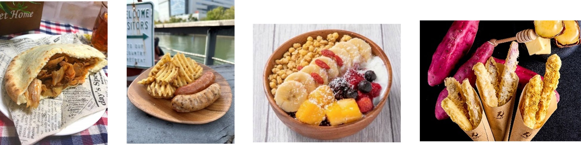 左から「THE BEST KEBAB」(ケバブ)、「POTALU」(ワッフルポテト等)、「美佳味」(アサイーボウル)、「天carat」(やきいも天ぷら)