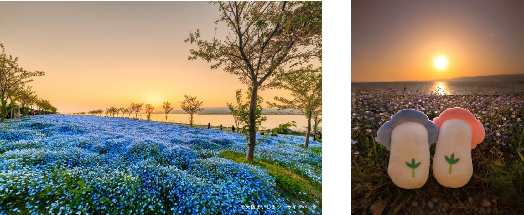 会場には大きな「MAISHIMA」モニュメントや季節の花とネモフィラのコラボレーションが見られるエリアなど、多数のフォトスポットを設けています。また、日没にかけてのロング営業を土日祝日・ゴールデンウィーク限定で実施します。「日本の夕陽百選」※にも選ばれた舞洲の夕陽に照らされて、昼間とは違った幻想的に輝くネモフィラをご覧いただけます。