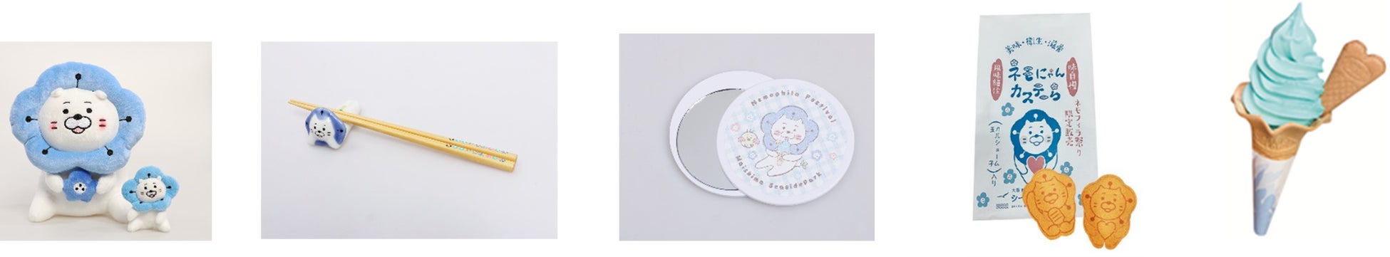 園内の「ネモにゃんショップ」では、青いソフトクリーム「ブルーアイ」の他、園内のネモフィラからミツバチが採取した「ネモフィラはちみつ」や「ネモにゃんのベビーカステラ」が人気です。また、ネモにゃんのお箸&箸置きや手鏡など、オリジナルグッズも多数取り揃えています。