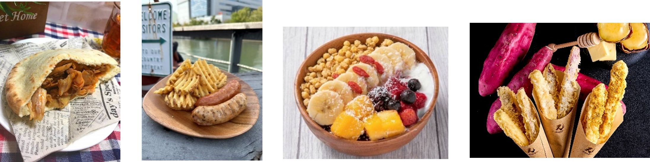 左から「THE BEST KEBAB」(ケバブ)、「POTALU」(ワッフルポテト等)、「美佳味」(アサイーボウル)、「天carat」(やきいも天ぷら)