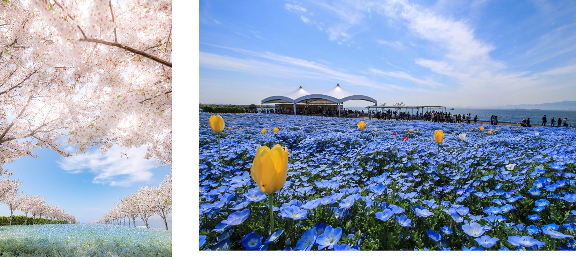~2026年4月11日(土)から5月10日(日)までの期間限定~ 関西最大規模!青いネモフィラと海、そして青空が織りなす絶景/桜&チューリップとネモフィラの色鮮やかなコラボゾーンを設置