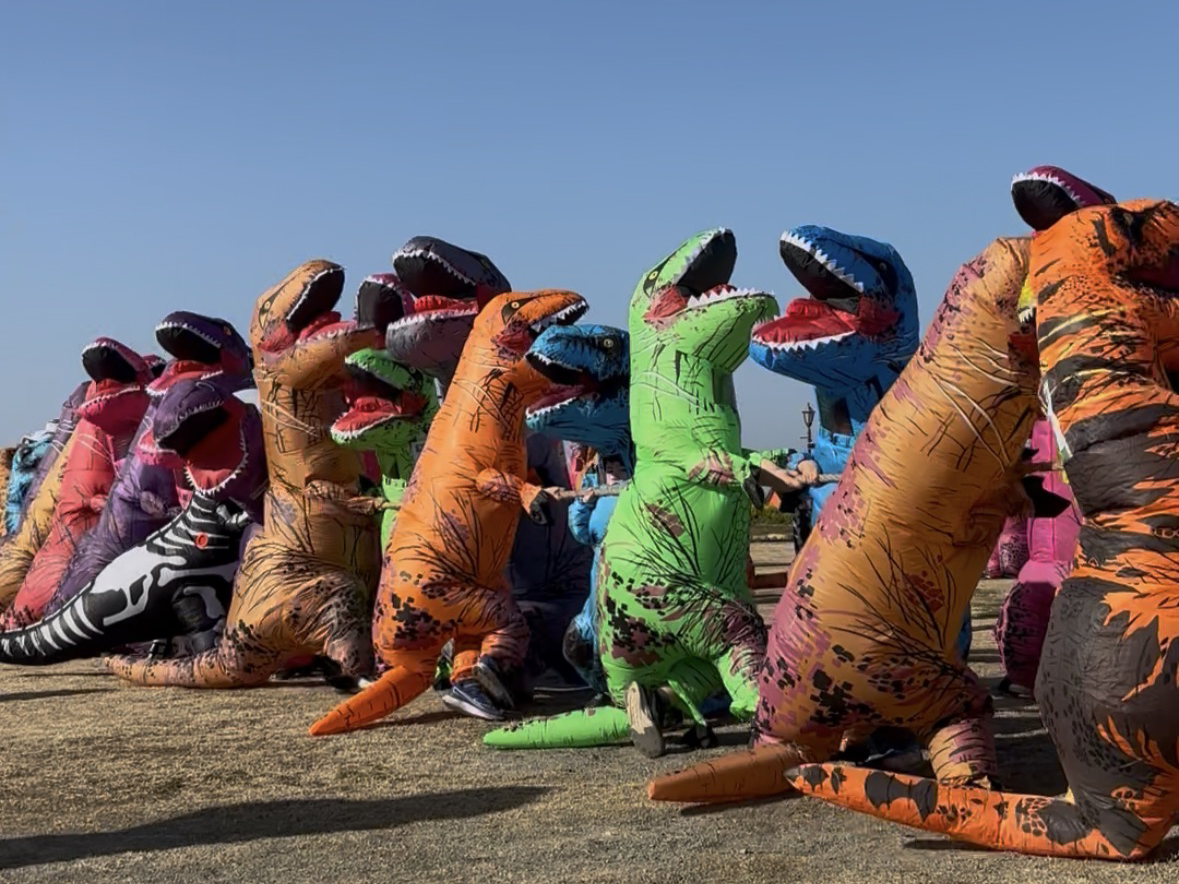 ティラノサウルスたちが個性豊かにデコレーションされたスーツを披露し、ティラノの皆様たちで一番を決める「ティラノファッションコンテスト」。