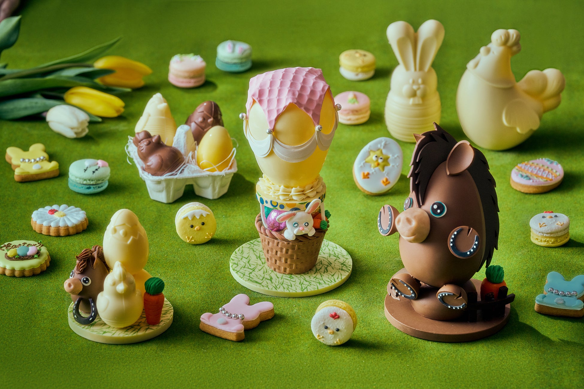 イースターの祝祭にふさわしい華やかな「イースタースイーツ コレクション」では、5種類のスイーツと、イースターバニーをモチーフにしたあんぱんをご用意いたします。今年の新作として登場するのは、気球に乗ったイースターバニーと、イースターエッグを2026年の干支である「午(うま)」をイメージして飾りつけた「イースターエッグ チョコレート」。繊細な細工をほどこし、まるでアートのような造形に仕上げたチョコレートは、ギフトにはもちろん、飾っても楽しめる愛らしい一品です。また、卵やルースター(ニワトリ)などイースターならではのモチーフのチョコレートを重ねた「イースターチョコレート アンサンブル」には、干支の午(うま)をモチーフにしたイースターエッグが新たに仲間入りし、装いも新たに登場。そのほか、毎年ご好評をいただいている、チョコレートでつくるカラフルなイースターエッグを卵パックに詰め込んだ「イースタースイーツ アソート」を今年もご用意いたします。また、ひよこや卵をモチーフにしたパステルカラーのマカロンとかわいらしいデザインのアイシングクッキー、イースターバニーをモチーフにしたあんぱんなど、春らしい色合いと味わいのスイーツとブレッドがラインナップ。季節の手土産やお子さまへの贈り物にも最適です。