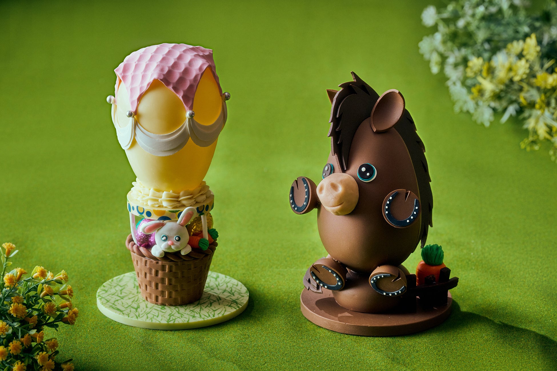 イースターシーズンのテーブルを華やかに彩る存在感のあるチョコレート。イースターの象徴とされるバニーが気球に乗った愛らしいデザインと、成功や前進のシンボルともいわれる干支の午(うま)をイメージし、繊細な細工をほどこしたチョコレートの2種類をご用意いたします。ミルクチョコレートやホワイトチョコレートをつかった優しい味わいを、土台まで余すことなくお楽しみいただけます。
