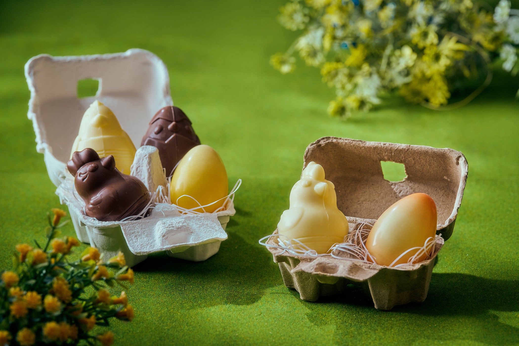 ミルクチョコレートとホワイトチョコレートでつくるルースターやヒヨコ、そしてカラフルにペイントしたイースターエッグを、遊び心あふれる卵ケースのパッケージに詰め合わせました。それぞれのチョコレートの中には、アマンディーヌやライスパフを忍ばせています。