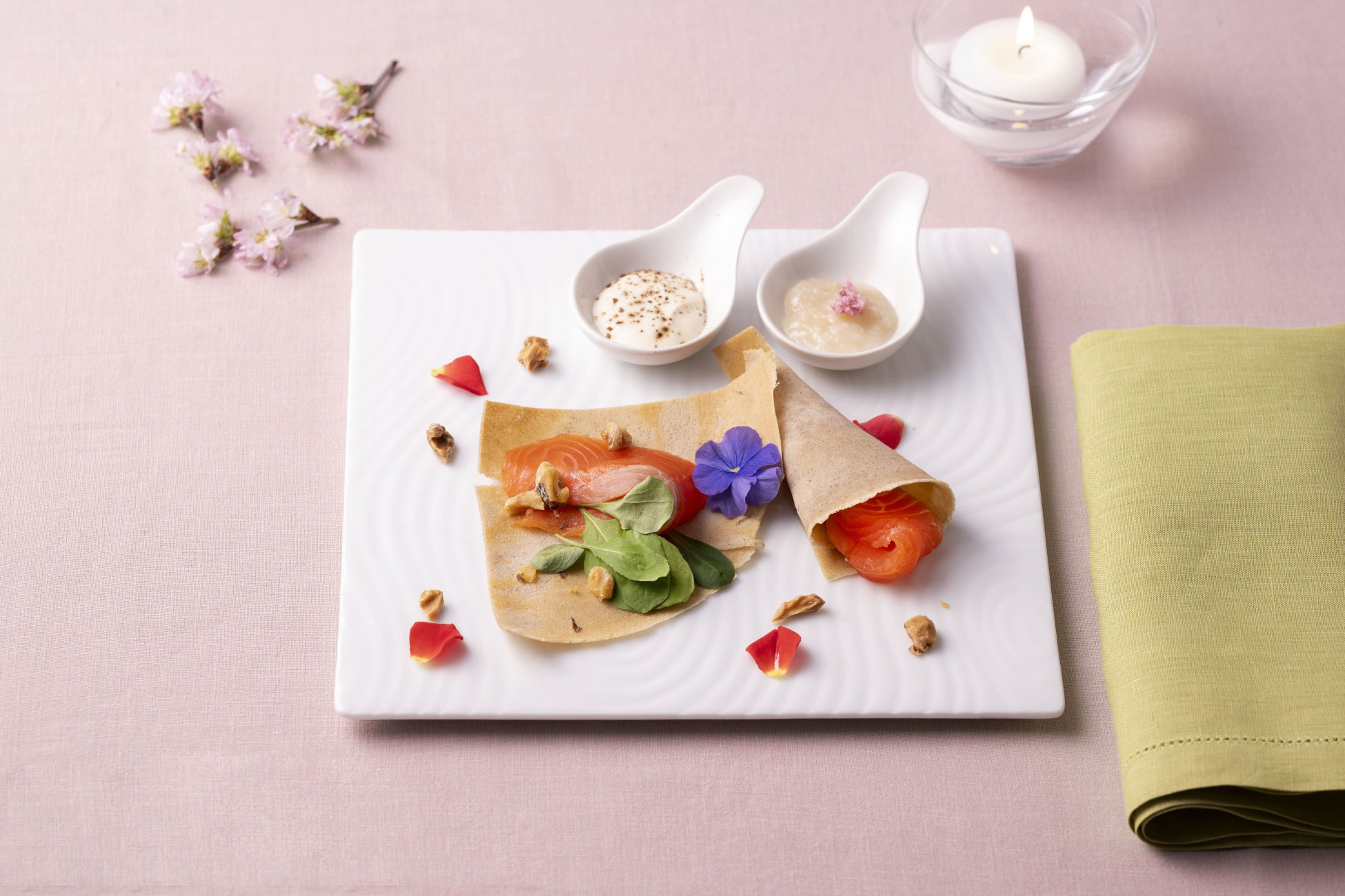 サクラマスの昆布締めと東御産くるみとそば粉のガレット 長野県産塩麹とサワークリームを添えて