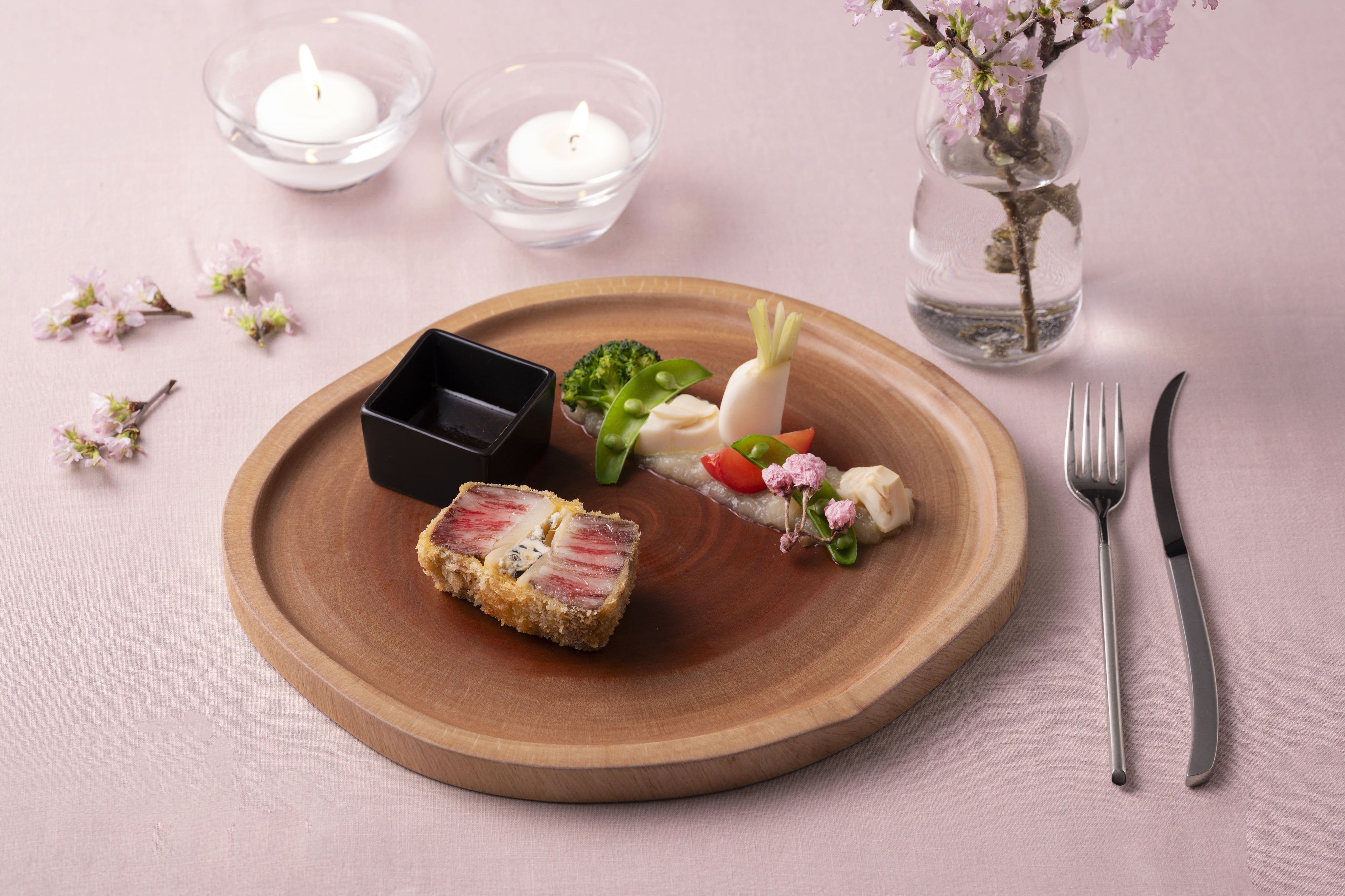 信州の豊かな食材を贅沢に用い、華やかで洗練された味わいに仕立てた、季節限定の特別コースをご用意。アミューズには、桜えびとアトリエ・ド・フロマージュのカマンベールを合わせた洋風さつま揚げをマーマレードの甘みを効かせたバルサミコソースで優雅に仕上げました。前菜には、長野県産桜肉のカルパッチョに、ウドと新玉葱の爽やかな香味を添え、春の気配を感じる一皿に。さらに、サクラマスの昆布締めをそば粉のガレットと合わせ、東御産くるみと塩麹の旨みで信州らしい味わいを表現しました。肉料理は、それぞれ異なる趣を持たせた二皿をご提供。一皿目は、香草パン粉をまとわせた仔羊のローストに山菜のフリットと黒にんにくのピューレを添え、奥行きのある味わいに仕上げました。続いて、信州プレミアム牛フィレとたけのこを重ねたミルフィーユ仕立てに、昨年11月スイスで開催された「World Cheese Awards 2025」でSILVERを受賞した、アトリエ・ド・フロマージュの芳醇なブルーチーズと、駒ヶ根産赤ワインソースを合わせました。深みのある余韻へと導く一皿です。締めくくりには、桜風味のホワイトチョコレートムースに軽井沢産苺とミントを添え、スパークリングワインのエスプーマとともに、春の軽やかさを感じるデザートをご堪能いただけます。