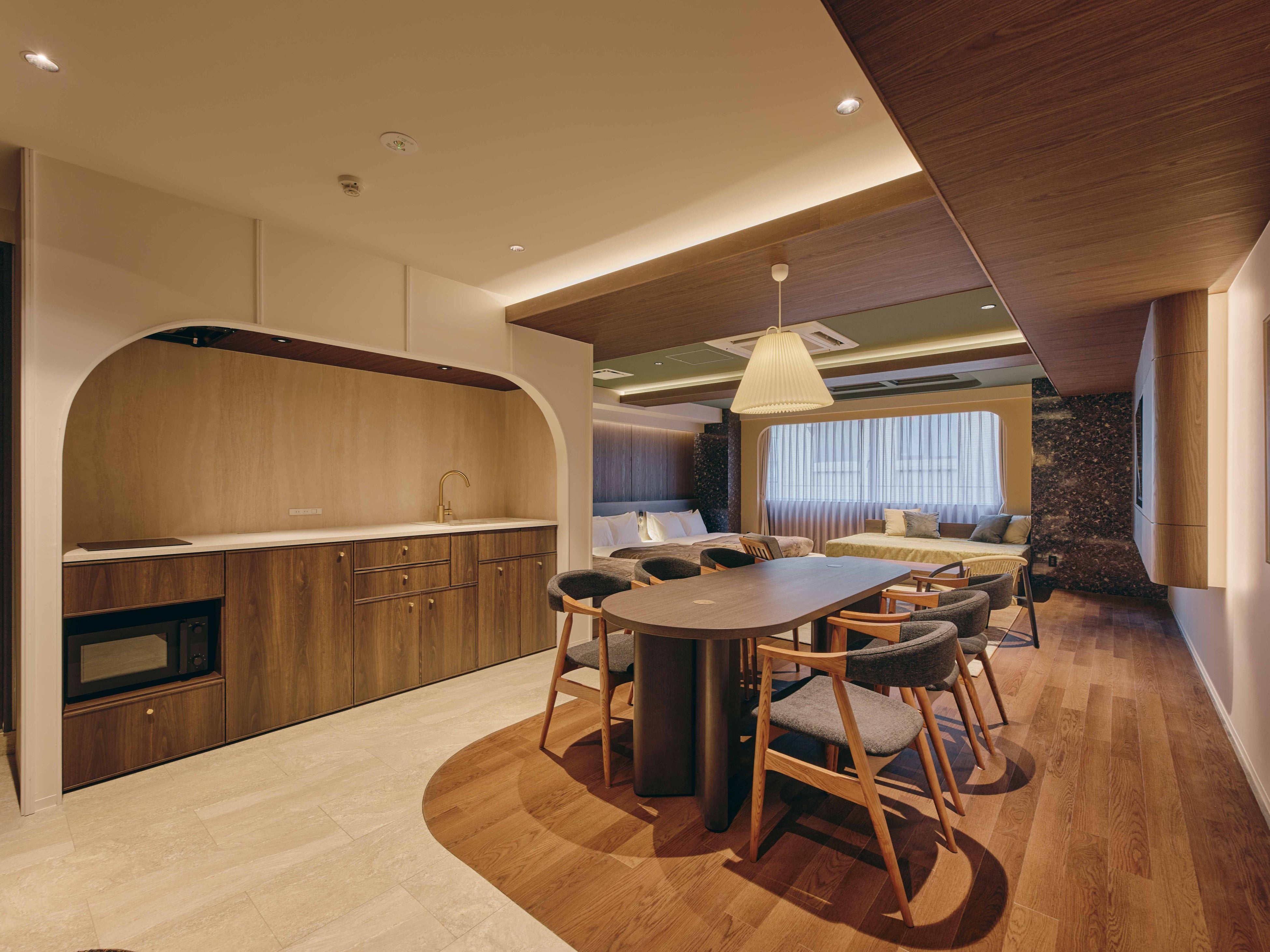 全客室内にリビング、ダイニング、キッチン、洗面スペースがあり、各エリアには「暮らし」に必要なアイテムをひと通りご用意しています。