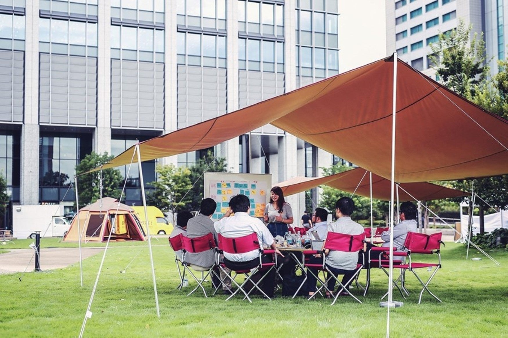 ビジネスの現場から一歩離れた緑の環境が、リラックスを促し、肩書を超えた対話を誘発する