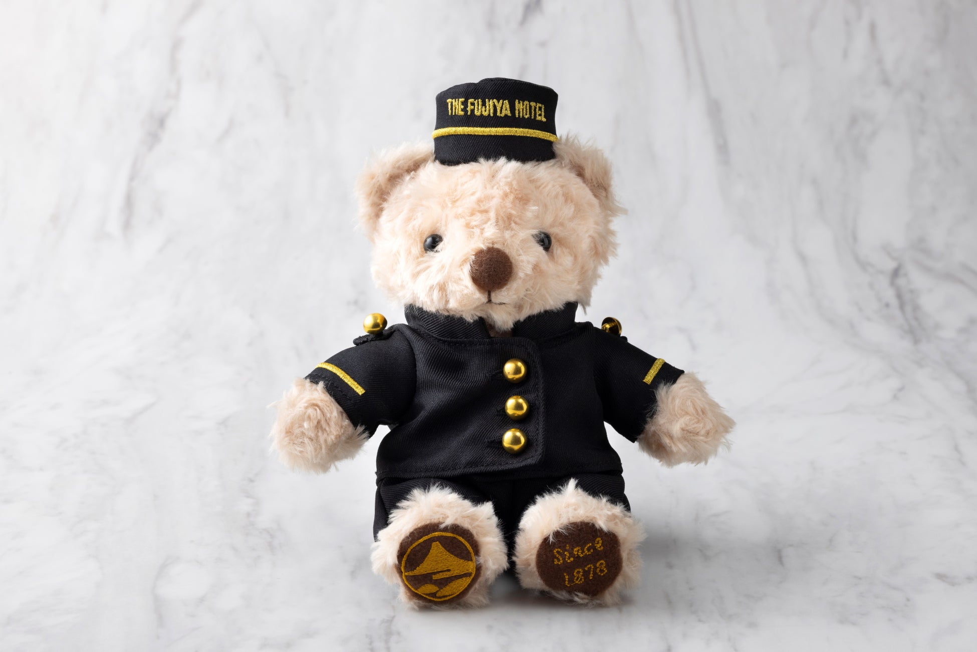 ベルスタッフユニフォームは、帽子やボタン、シルエットに至るまで細部にこだわり、長い年月をかけて受け継がれてきた富士屋ホテルならではの装いを表現。やさしい表情のテディベアと端正なユニフォームが調和し、品格を感じていただけるデザインに仕上げました。