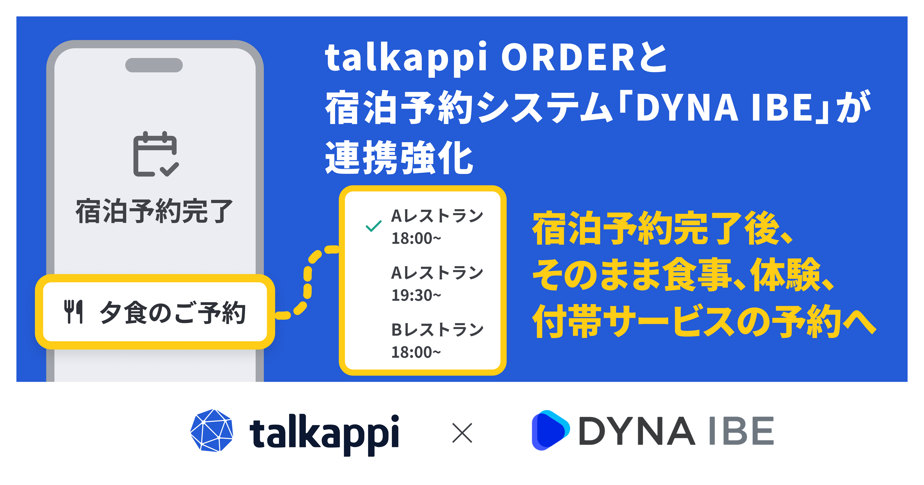 宿泊予約システム「DYNA IBE」が、付帯サービス予約・手配システム「talkappi ORDER」と連携することで、宿泊予約完了画面上に付帯サービス予約ボタンを表示できるようになりました。これにより、利用するサービスおよびその利用日時を、宿泊予約時点であらかじめ確定することが可能になります。