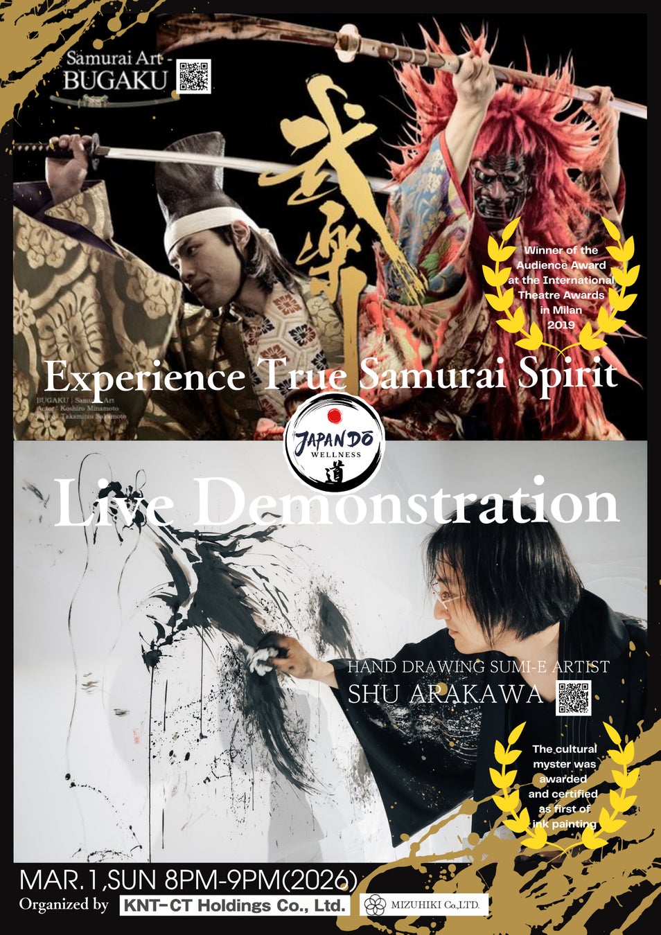 演者:①武楽座(ミラノの国際演劇賞において、能×武士道「織田信長の能舞再現」で観衆が選ぶ最高賞受賞)②荒川颼(唯一無二の指書道墨絵パフォーマー、国内外で数々の賞を受賞)