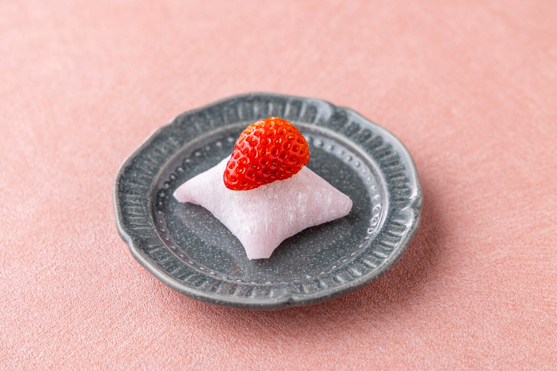 淡いピンクの春色の求肥に包まれた濃厚抹茶ムースといちごが重なり、しっとりとした味わいが続くいちご大福。