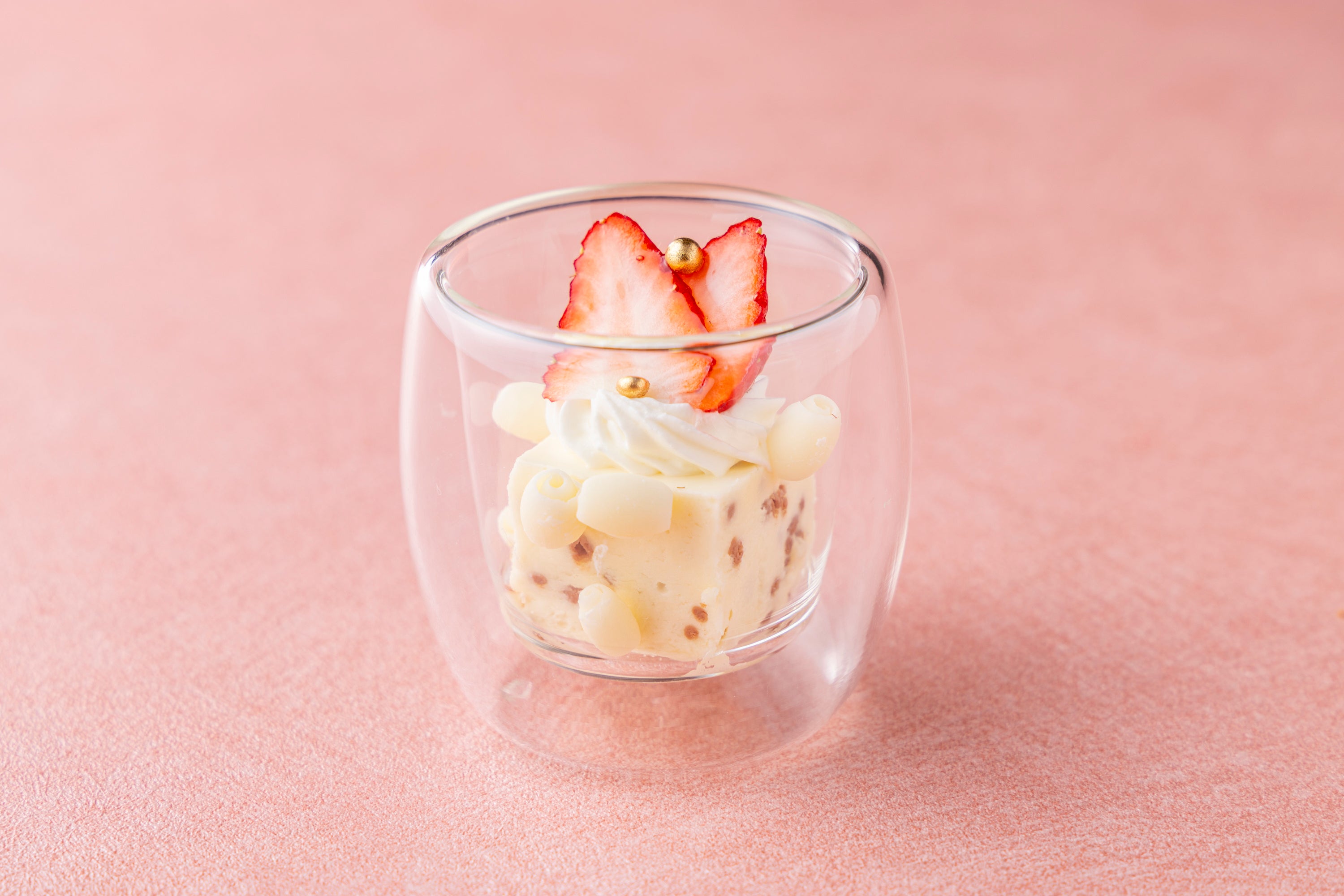 水分に触れるとパチパチと弾けるクリスピーを閉じ込めたレアチーズケーキ。濃厚な味わいの中に、ホワイトチョコレートの食感が軽やかなアクセントを添えます。