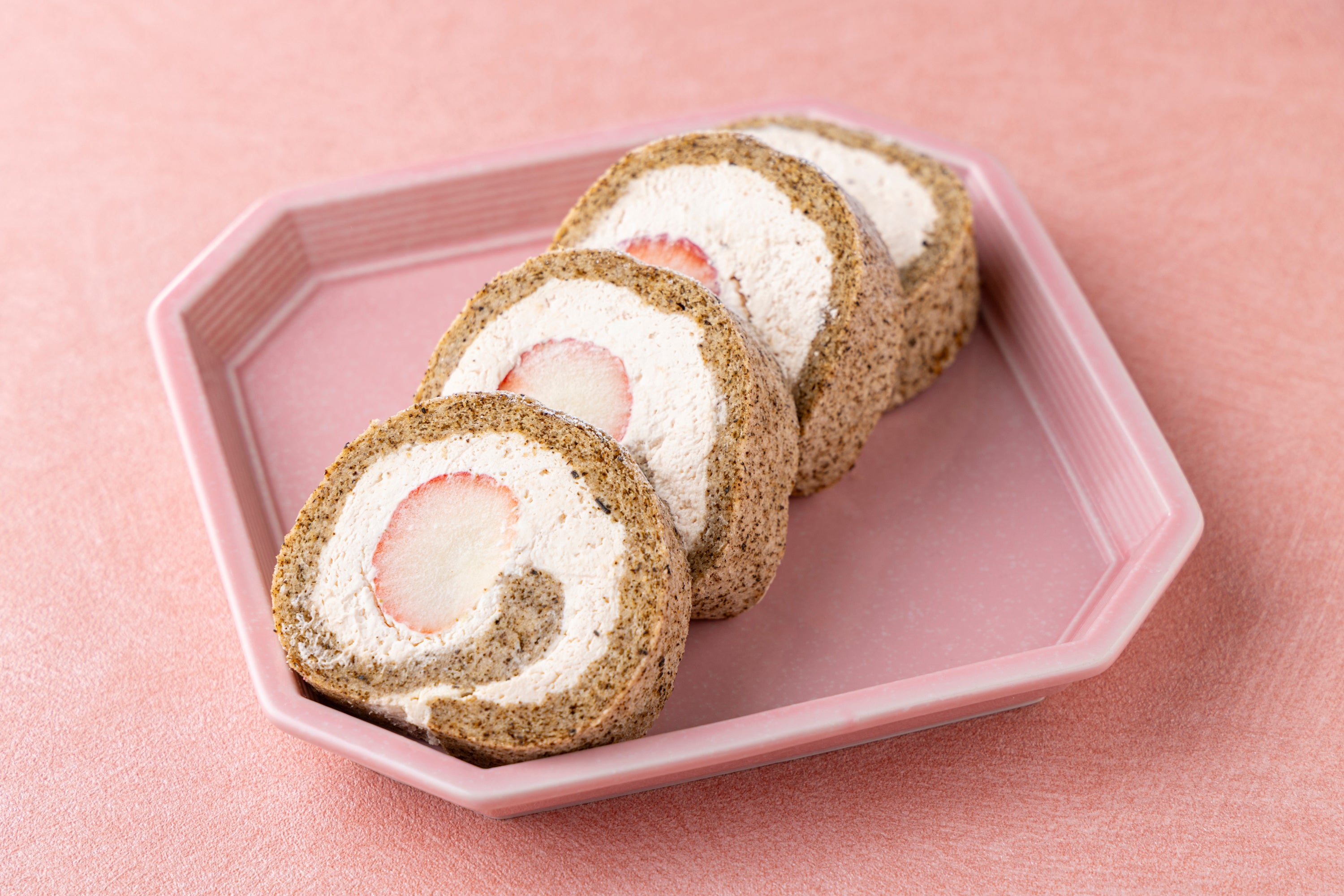 紅茶がやさしく香る甘さ控えめのクリームと、瑞々しく大粒な美濃娘いちごを贅沢に包み込んだロールケーキ。