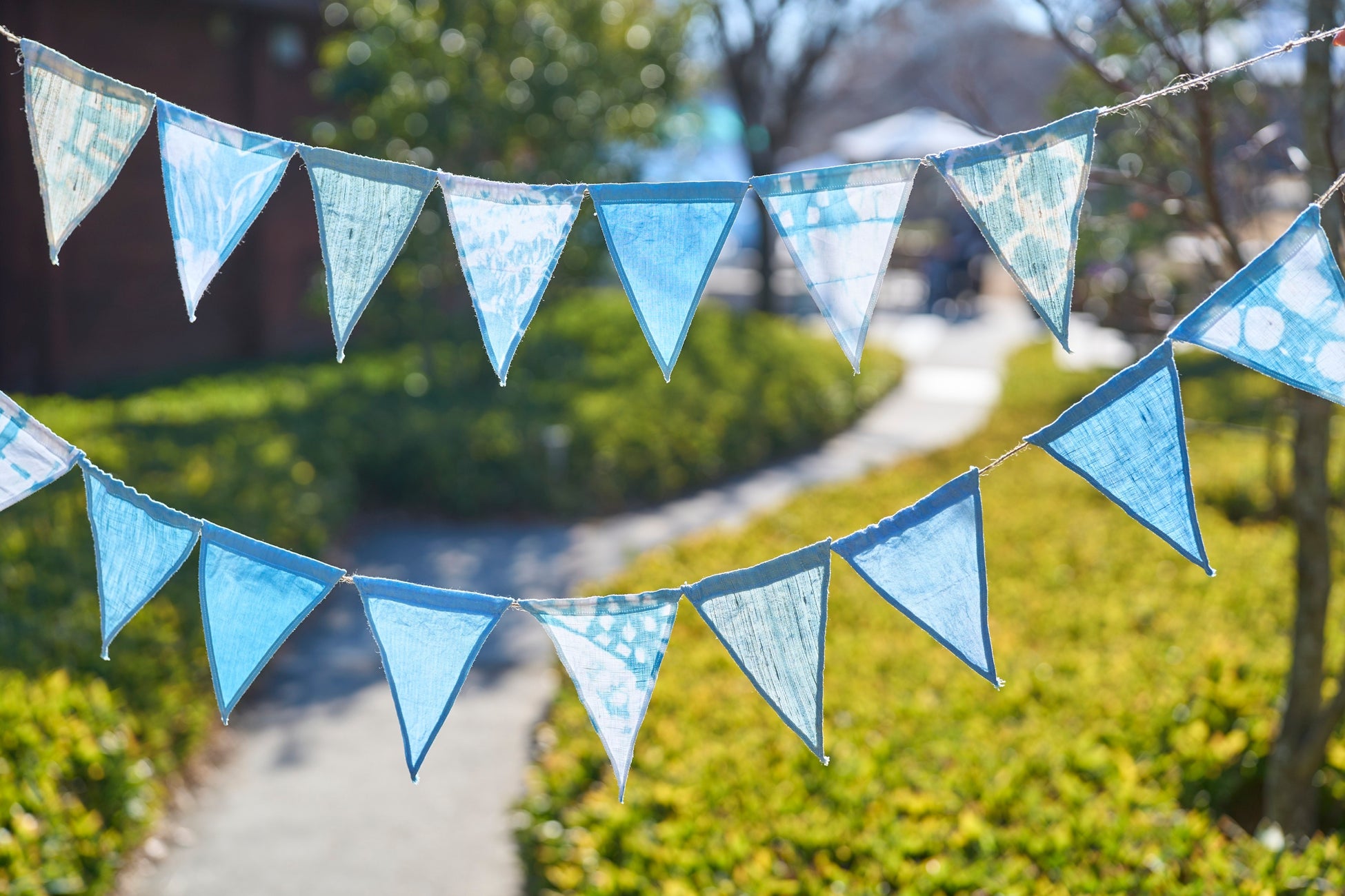 藍が持つ自然の力と日本の染色文化に触れる「ジャパンブルーのガーランドづくり」を開催いたします。布を絞り、染める工程を通して、天然染料ならではの色味や風合いの変化をお楽しみいただけます。絞り方によって、一つひとつ異なる表情に仕上がるのも魅力です。染め上がった布をガーランドとして仕立て、ピクニックやキャンプシーン、お部屋のインテリアとしてお使いいただけます。