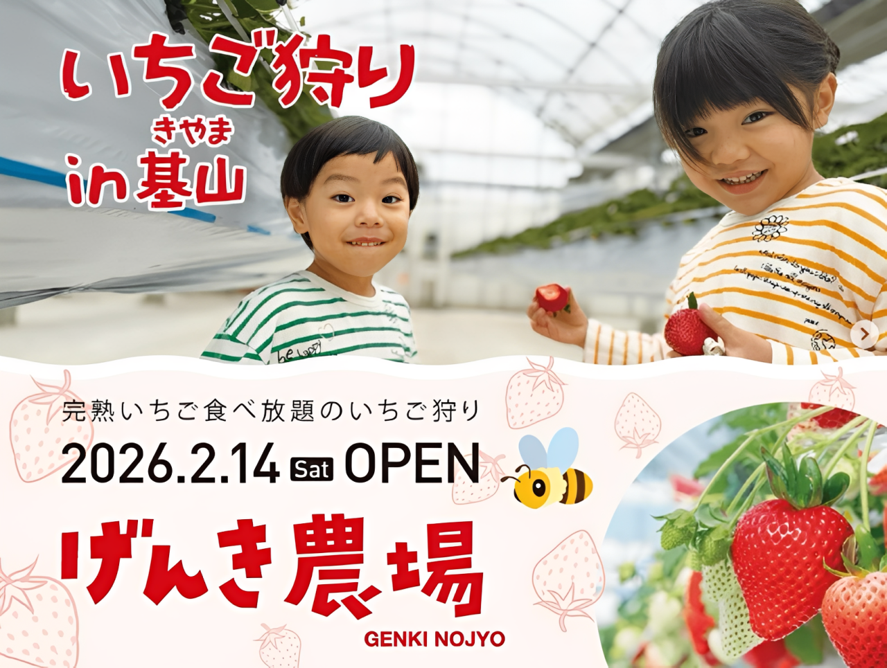 渡辺パイプ株式会社のグループ会社である株式会社げんき農場(本社:埼玉県羽生市、代表取締役:阿部 茂喜、以下「げんき農場」)は、佐賀県基山町にある基山農場にて、2026年2月14日(土)より、いちご狩り体験ができる観光農園をグランドオープンいたします。