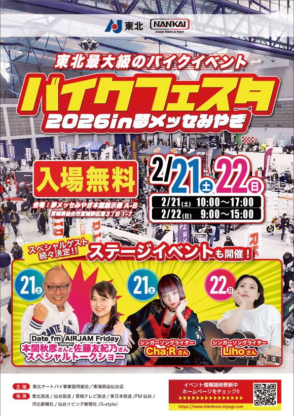 JAF(一般社団法人日本自動車連盟)宮城支部(支部長 梅津 行雄)は、2月21日(土)~2月22日(日)の2日間、夢メッセみやぎ(宮城県仙台市宮城野区港3丁目1-7)で開催される「バイクフェスタ2026」にJAFブースを出展します。