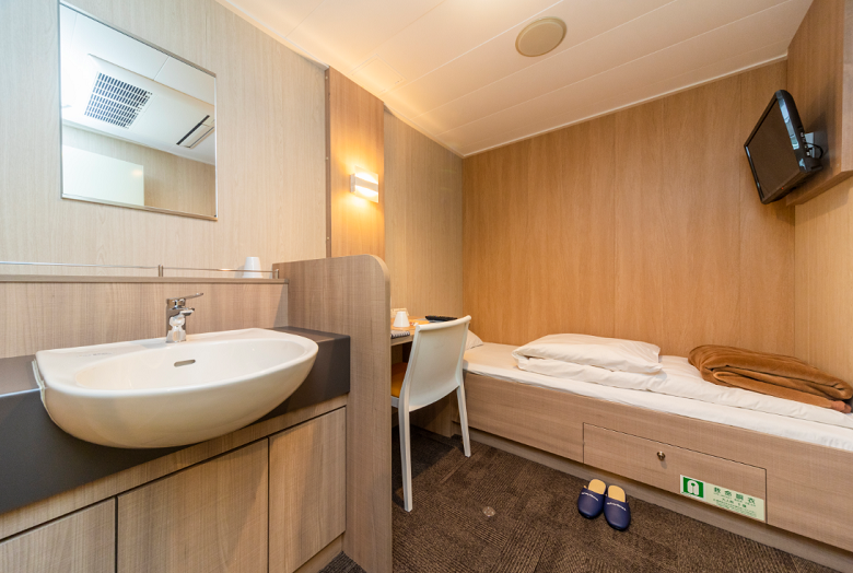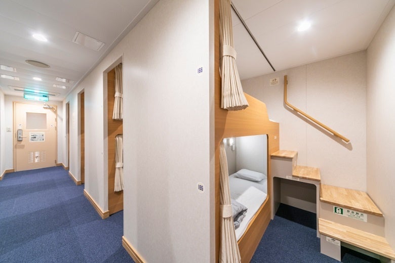 2段ベットの他人数部屋になりますが、ベットは向かい合わせではないので、相部屋感は少ないです。