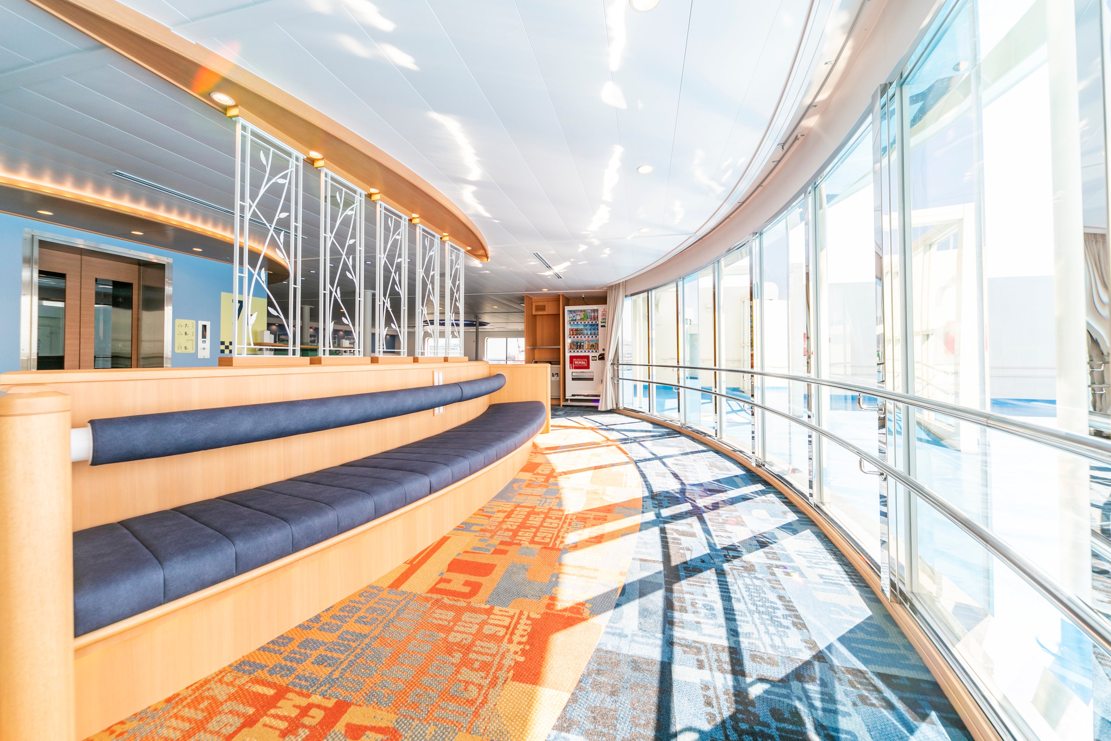 瀬戸内海の夜景や星々を見ながらの露天風呂や地方銘柄の刺身など、快適な船旅を演出する充実したパブリックスペースも魅力の一つ