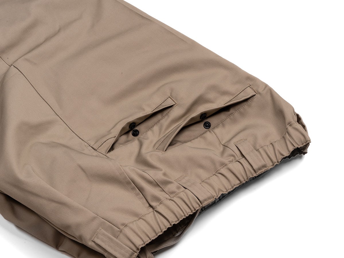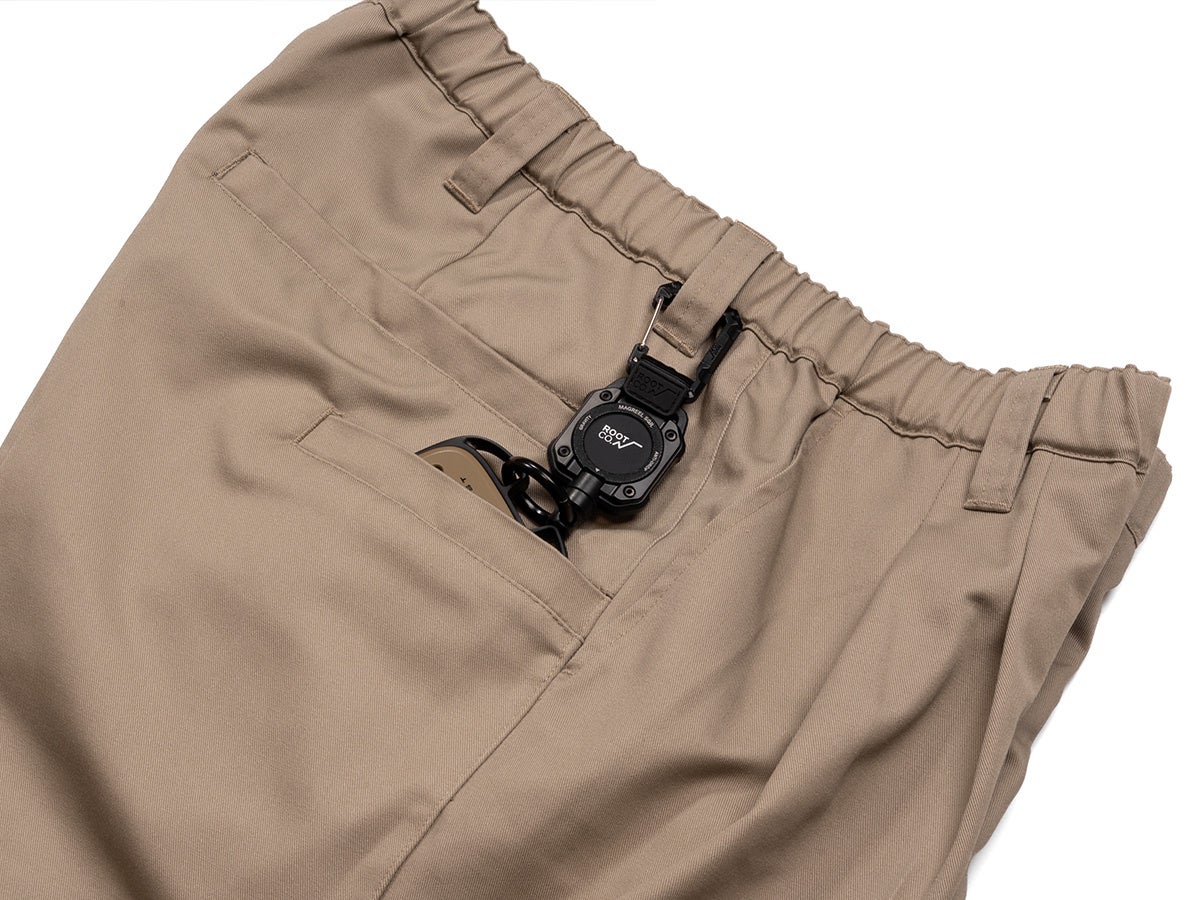 スマートフォンなどの収納に便利なギアポケットや、ウエストゴムと内側のドローコードによる安定したフィット感など、フィールド由来の実用性を日常着へと落とし込んでいます。