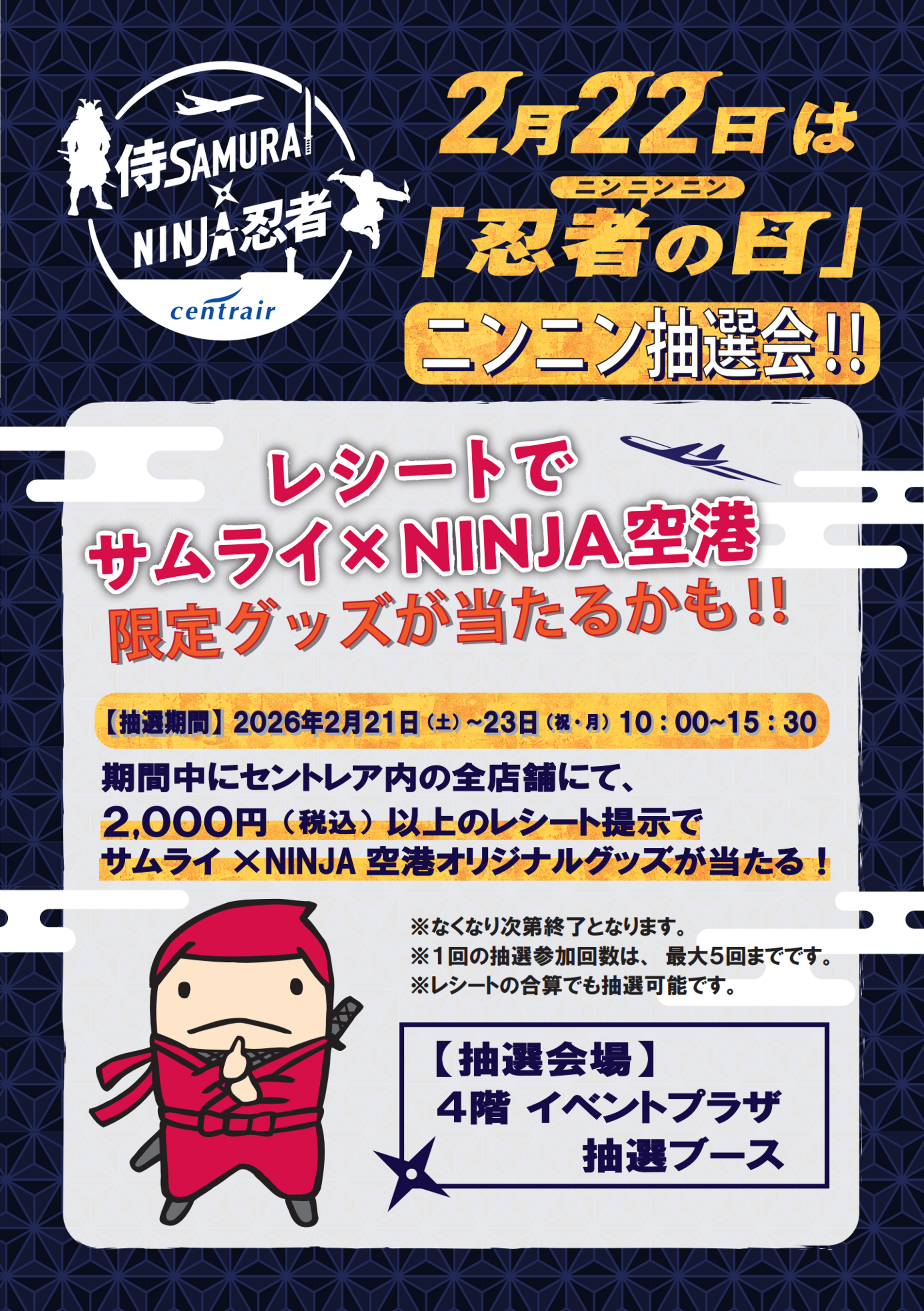 4階イベントプラザ「ニンニン抽選会」ブースにてはずれなしの抽選会を開催!空港内の全店舗を対象に2,000円以上(税込・合算可)のお買上げレシートで抽選会に参加して限定グッズをゲットしよう!