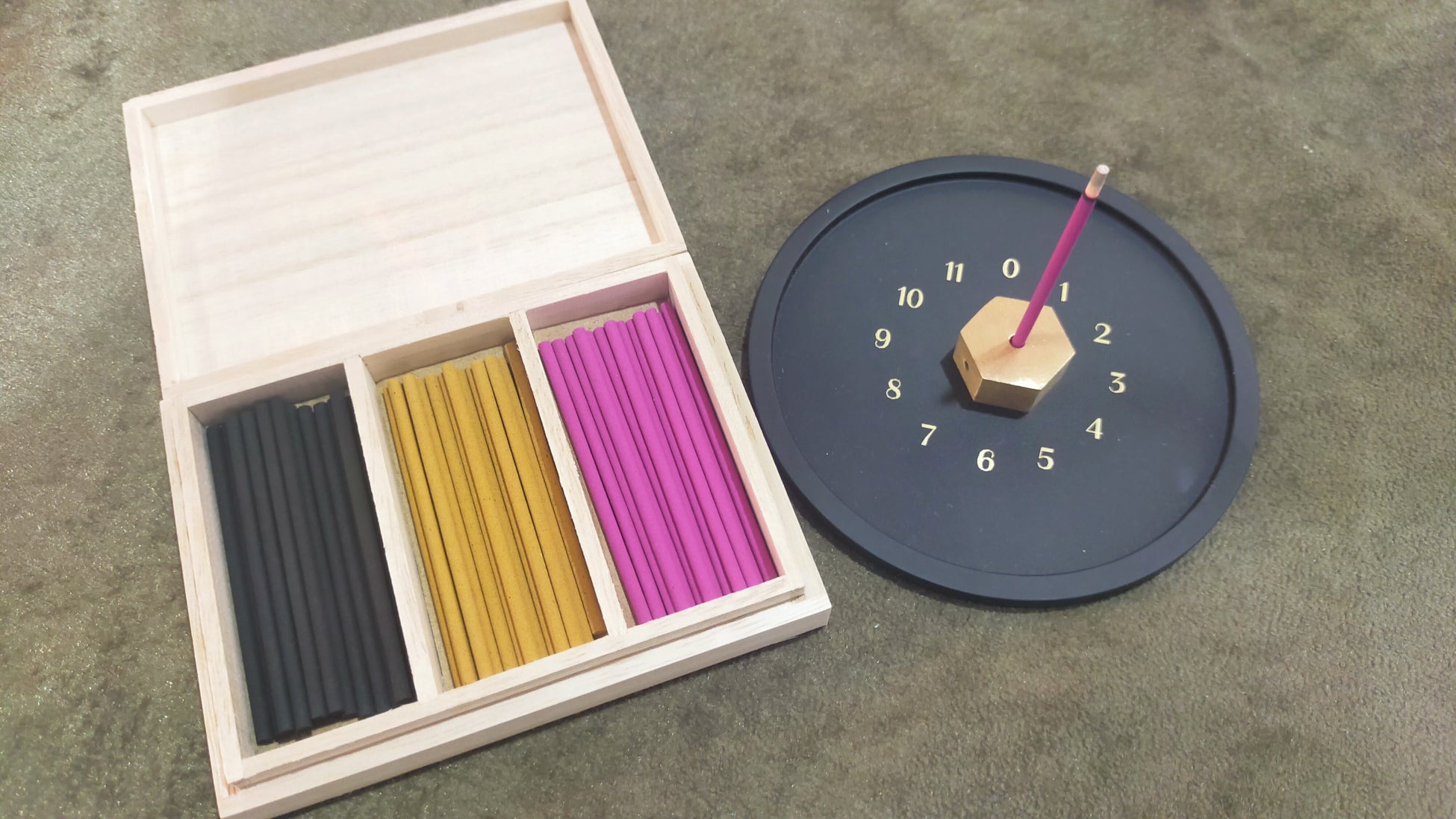 0~11が同心円状に書かれている専用のお香皿を使い、お線香の灰が落ちた番号のメッセージを受け取る占いです。
