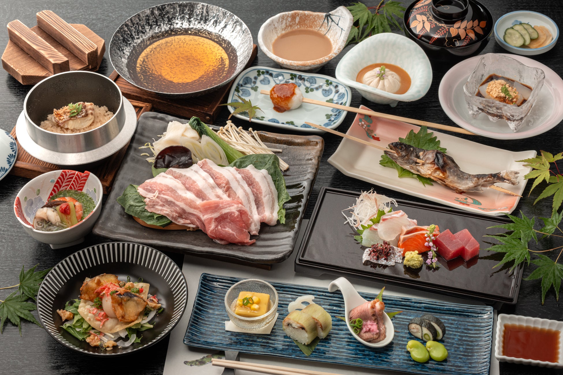 ご夕食は、甘みの強い脂身が特徴の「那須三元豚」をメインとした会席料理。料理長手作りの胡麻豆腐や栃木名物の湯葉など、地元の恵みが並びます。