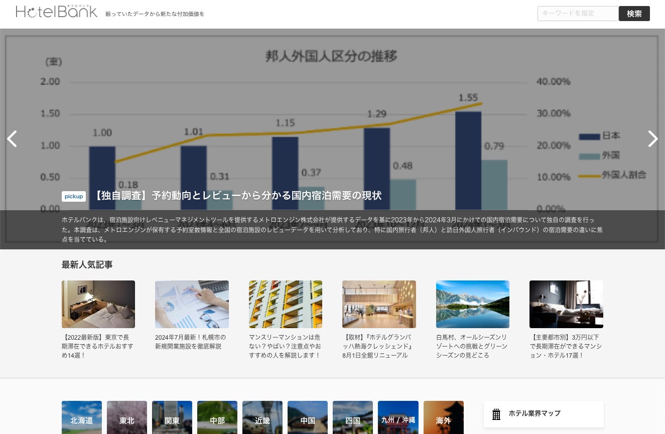 宿泊や観光関連のニュース情報をお届けするホテル特化型メディアです。また、メトロエンジンが独自に保有する宿泊関連データを活用した市場調査・分析記事もお届けしています。