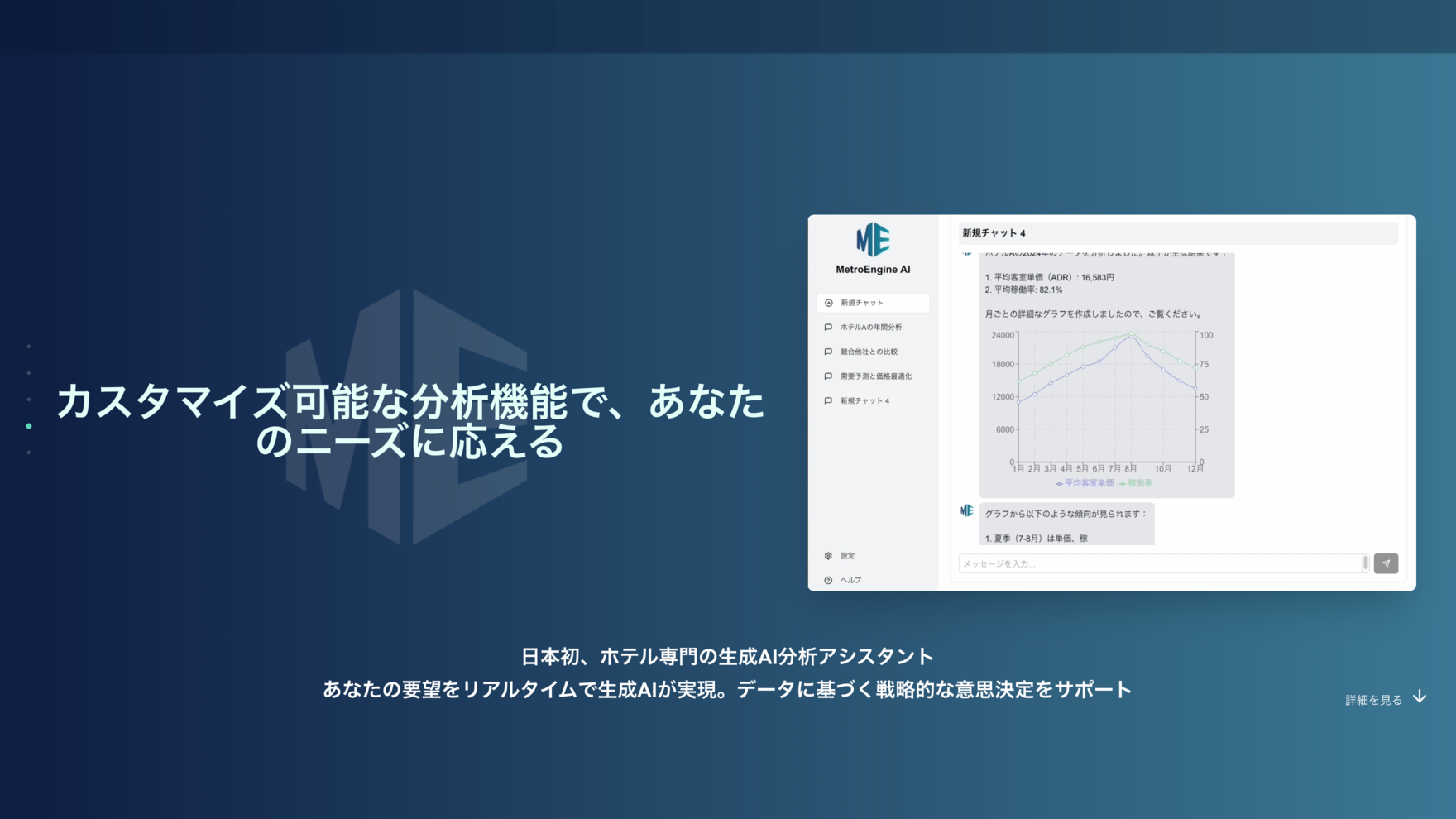 ホテルの経営データを総合的に分析し、現状分析や収益最大化のための戦略提案を行う次世代のAIアシスタントです。 ユーザーからのリクエストや質問を受け、客室単価、稼働率、RevPARなどの重要指標の分析から、 競合他社との比較、需要予測まで幅広く対応し、自然な会話形式でリアルタイムに回答します。