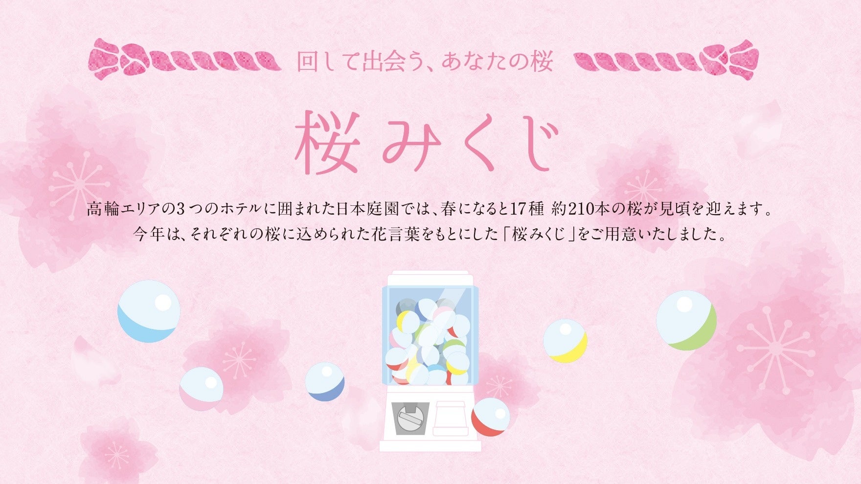 【内 容】 各種イベント(桜の特等席で味わう絶景朝食、桜の竹あかりライトアップ、桜のワークショップ ほか)、桜のロビーアート、桜が一望できるステイプラン、彩り豊かな春の美食メニューなど