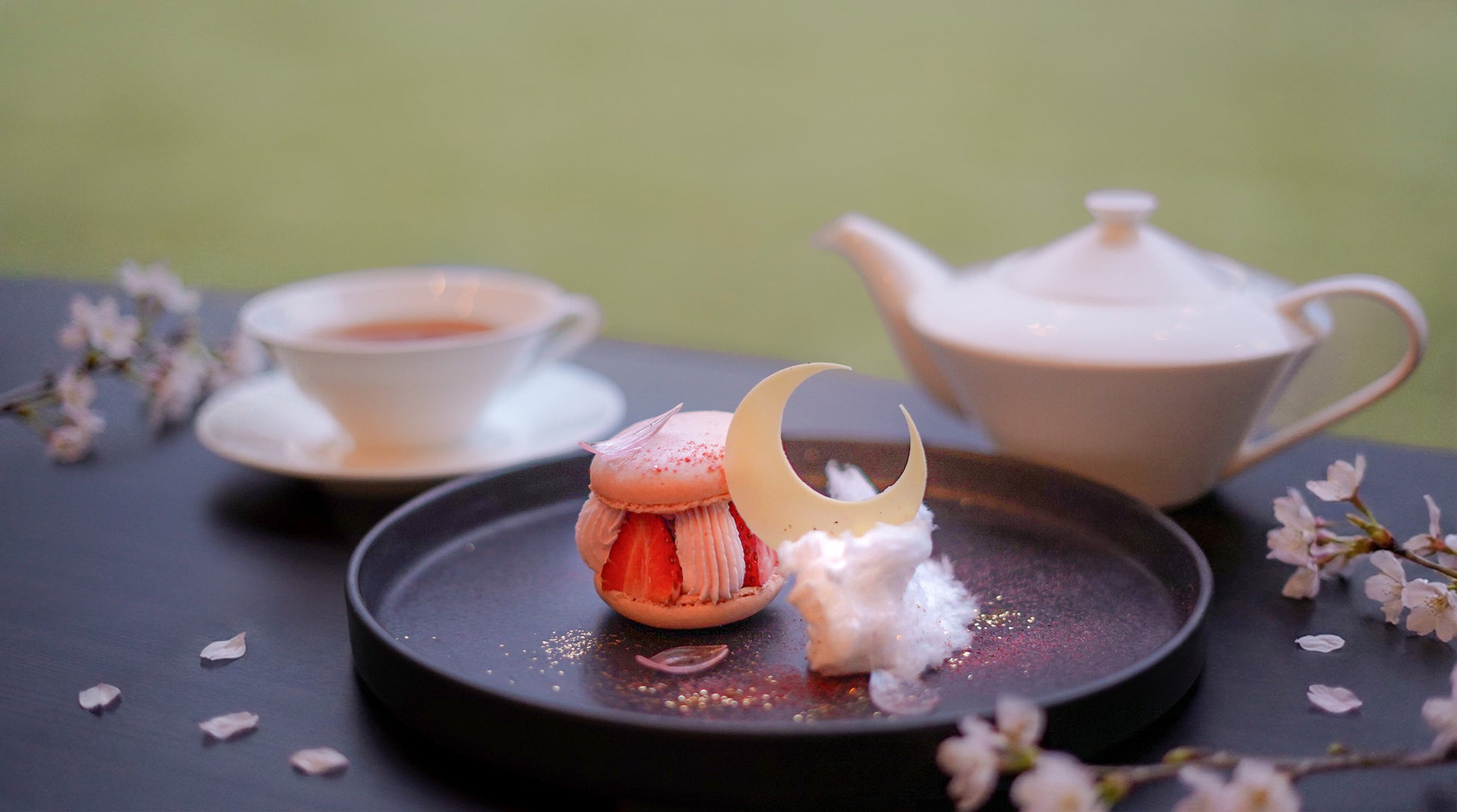 春のお月見をイメージしたパティシエ特製スイーツとさくら紅茶のセット。