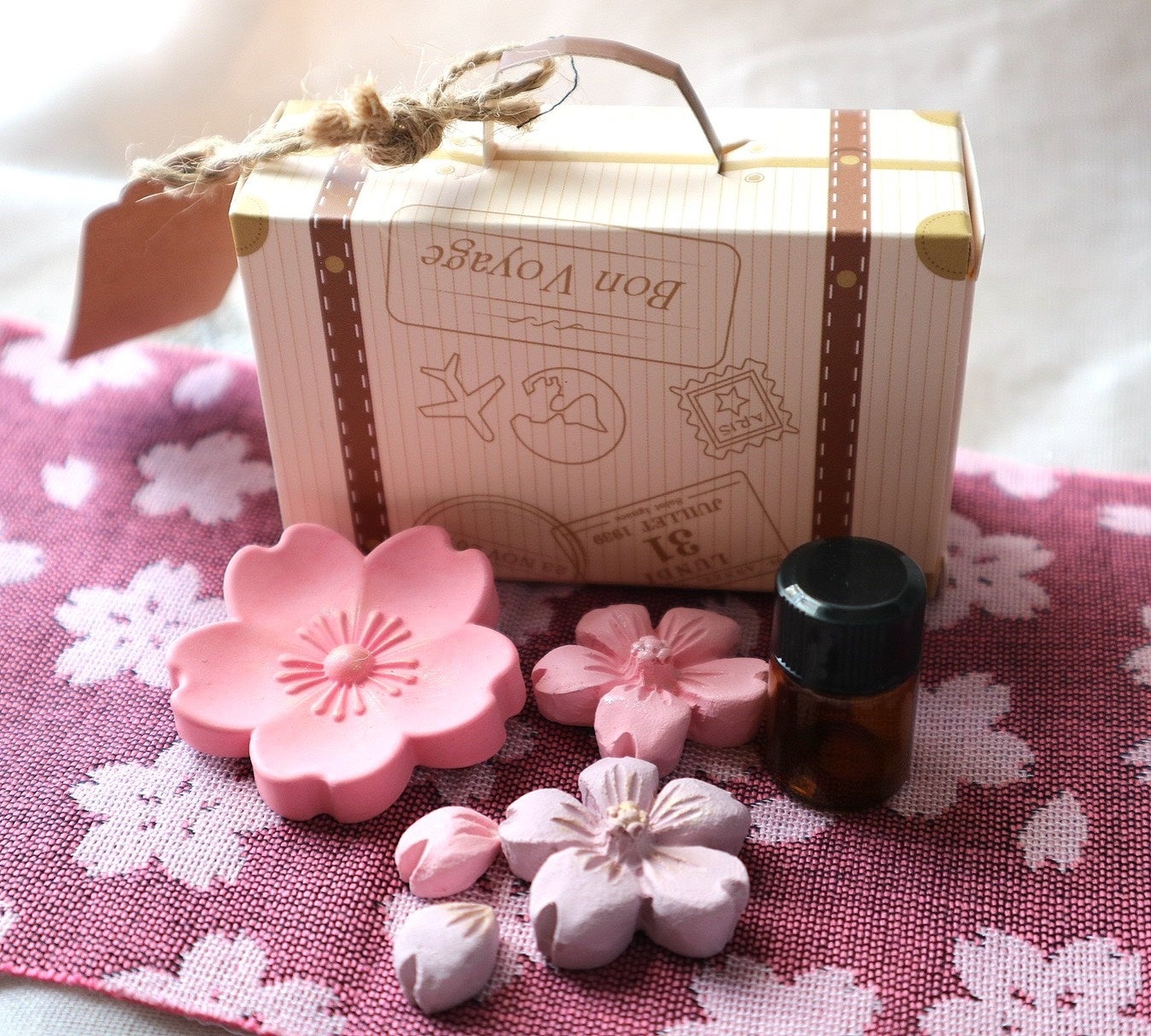 石膏を用いて桜の形のストーンを作り、アロマを垂らしたストーンと春のお花でアレンジボックス作りをご体験いただけます。