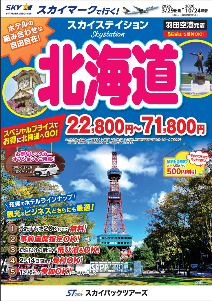 スカイパックツアーズ株式会社(本社:東京都中央区、社長:横山正巳)は、スカイマークを利用した価格固定型のパンフレット旅行商品「スカイステイション 北海道」【羽田空港発着】(2026年3月29日出発~2026年10月24日帰着)の販売を開始します。スカイマークだけを取り扱う専売店だからできるスペシャルプライス!早めのご予約がお得です。また、オンライン専用のスカイマーク公式ダイナミックパッケージ『たす旅』ではクーポンセール 実施中♪8月から10月の予約が特にお得!