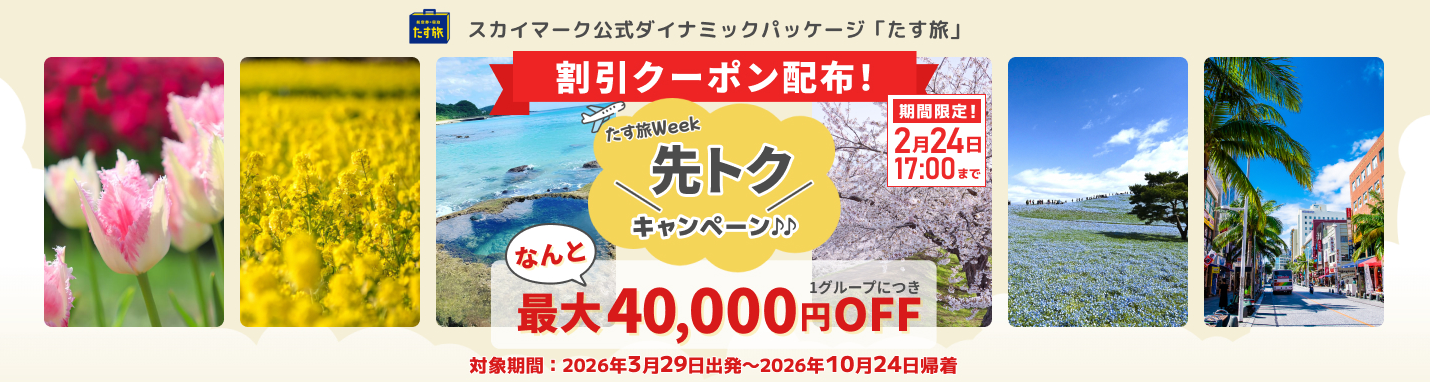 【WEB予約限定】ダイナミックパッケージ『たす旅』にて先トクキャンペーン実施中!最大40,000円引きの期間限定クーポンを使っておトクに旅しよう!お安い航空運賃は早い者勝ち♪今すぐご希望のご出発日でチェック!