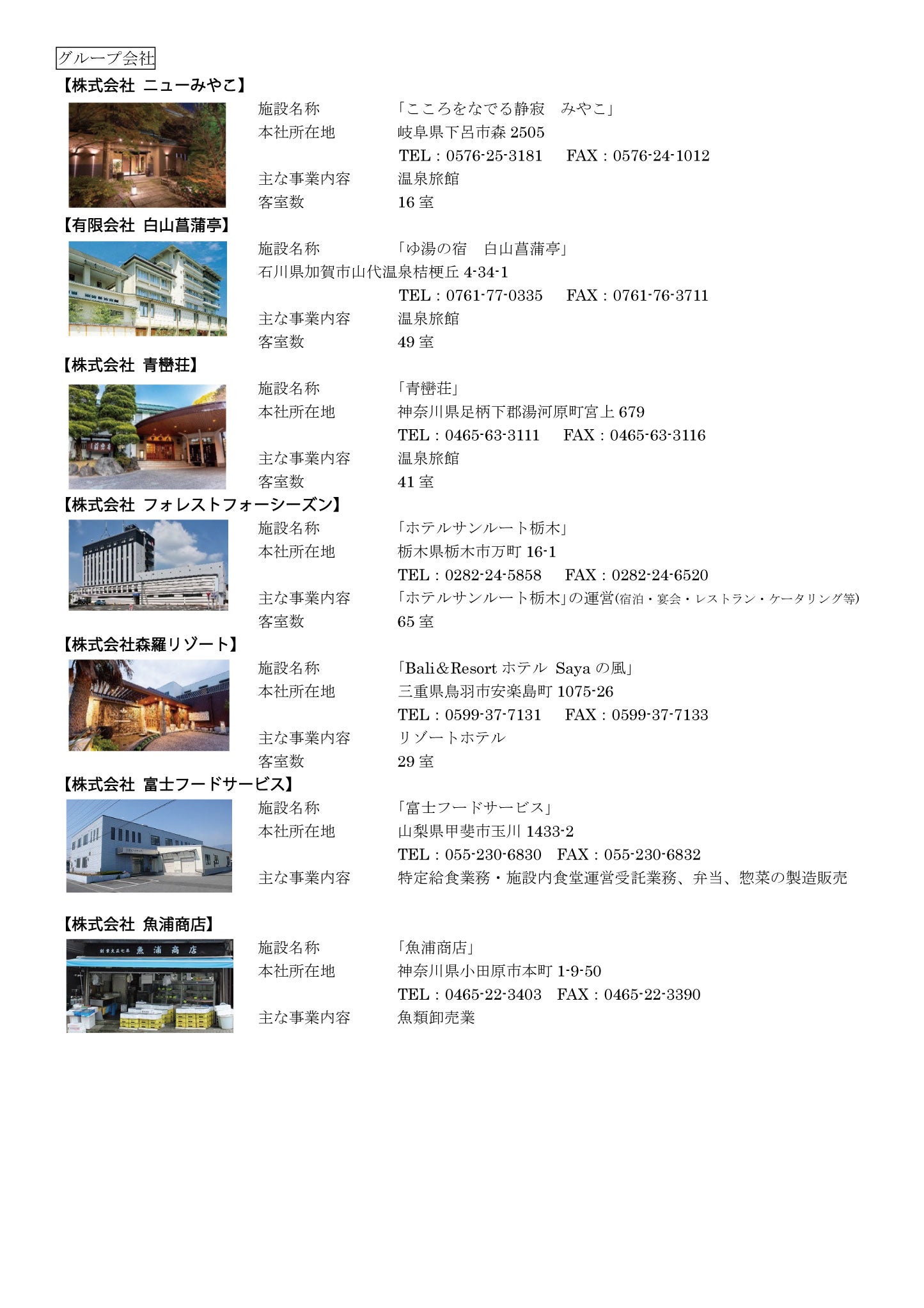 株式会社フォレストは宿泊業だけではなく平成22年にバス事業・旅行業の許可・登録を取得しました。 バス旅行と宿泊を一社で一括して行うことで、魅力あふれるツアーをリーズナブルなお値段にてご提供することが可能となり、皆様に大変ご好評をいただいております。また、平成25年に学校給食を手掛ける株式会社富士フードサービス、平成26年に魚類卸売業の株式会社魚浦商店、平成27年にホテルサンルート栃木を運営する株式会社フォレストフォーシーズン、平成29年にこころをなでる静寂 みやこを運営する株式会社ニューみやこ、令和4年に湯の宿 白山菖蒲亭を運営する有限会社白山菖蒲亭の株式を取得、令和6年11月にフォレストリゾート初のフォレストグランピングリゾート稜「ITU」(栃木県那須郡那須町)、令和7年12月にBali&Resortホテル Sayaの風(三重県鳥羽市安楽島町)の運営を開始し、食事提供部門と宿泊部門のさらなる強化も進めております。「宿泊」「飲食」「バス」の各事業が伴うことで、観光旅行~ビジネス宿泊~教育旅行等すべてを網羅し、皆様の旅をトータルプロデュースさせていただく所存です。