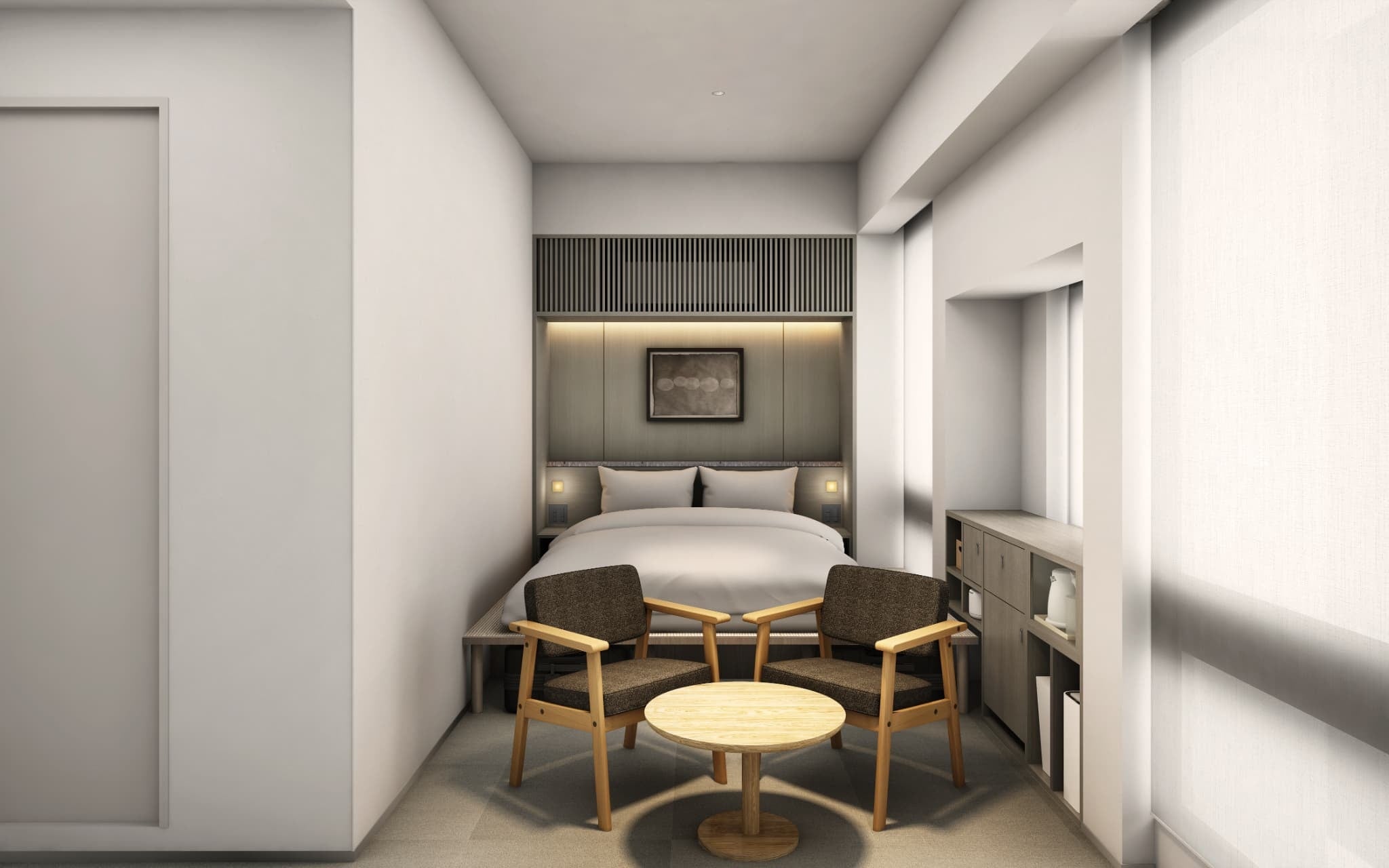 客室には、無印良品の家具やインテリアアイテムを中心に、京都を拠点とするアーティストや京都近郊で活動する作家の作品を取り入れました。シンプルな空間の中に、穏やかで落ち着きのあるしつらえを施し、ゆったりとくつろげる雰囲気を大切にしています。滞在のひとときが心をほどき、日々の暮らしに小さな気づきを持ち帰っていただける、そんな空間です。