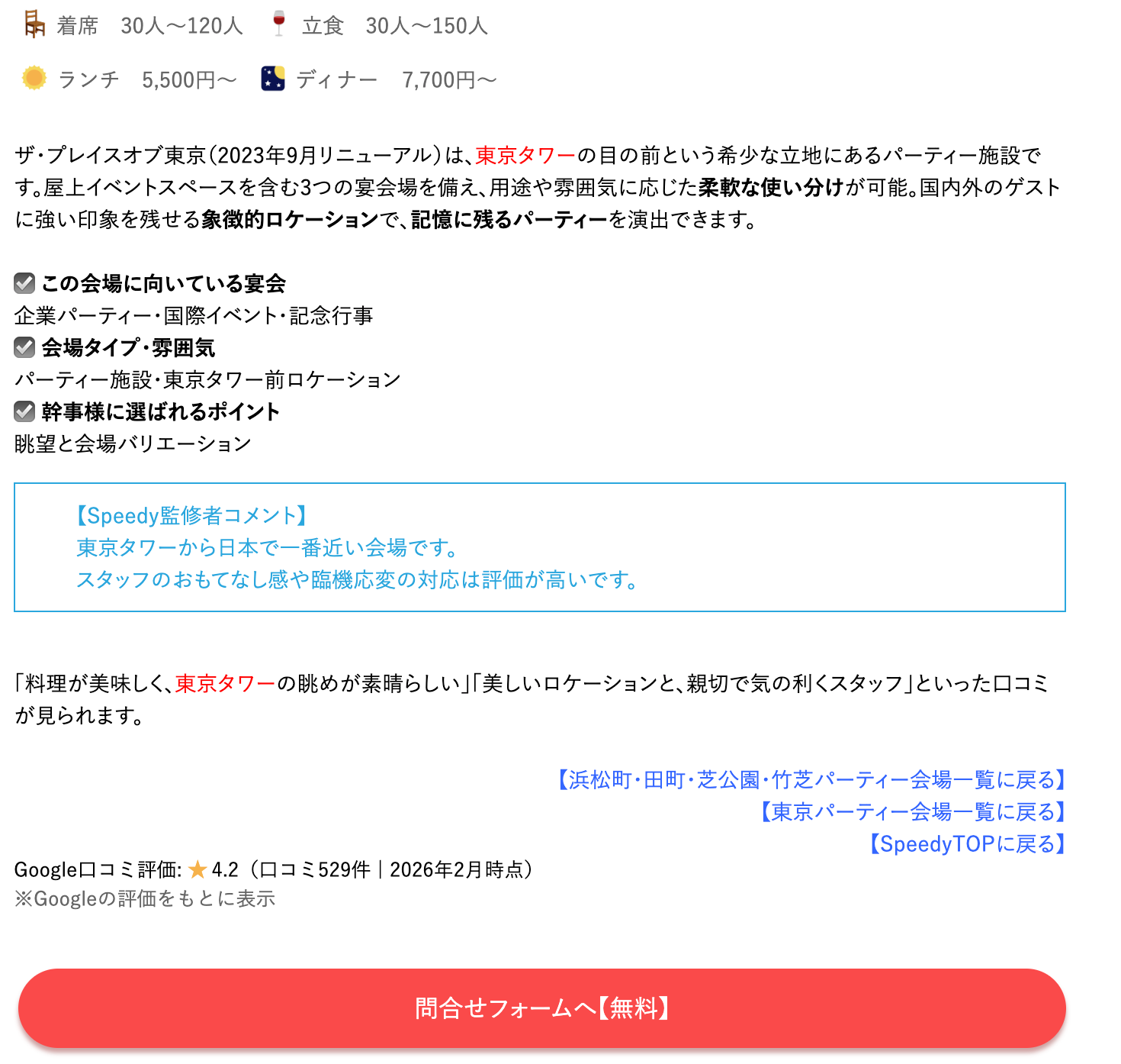 会場写真・強みタグ・料理ジャンル・人数・予算・Speedy監修者コメント・Google口コミなどから比較可能