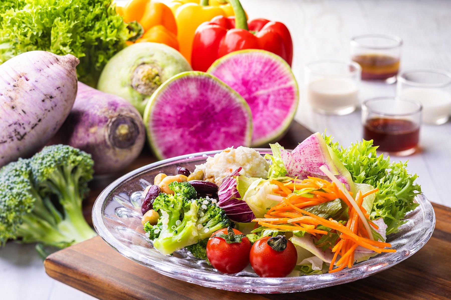 無農薬・無化学肥料栽培を行っている所沢市の陽子ファームから直送される、新鮮な旬野菜をご用意。有名な米酢を基にした、旨味のある二杯酢風味で万能な「ふりかけ酢」や、アサイーを使用した甘酸っぱいホテルメイドのドレッシングを合わせ、シンプルな素材本来の魅力を引き出します。