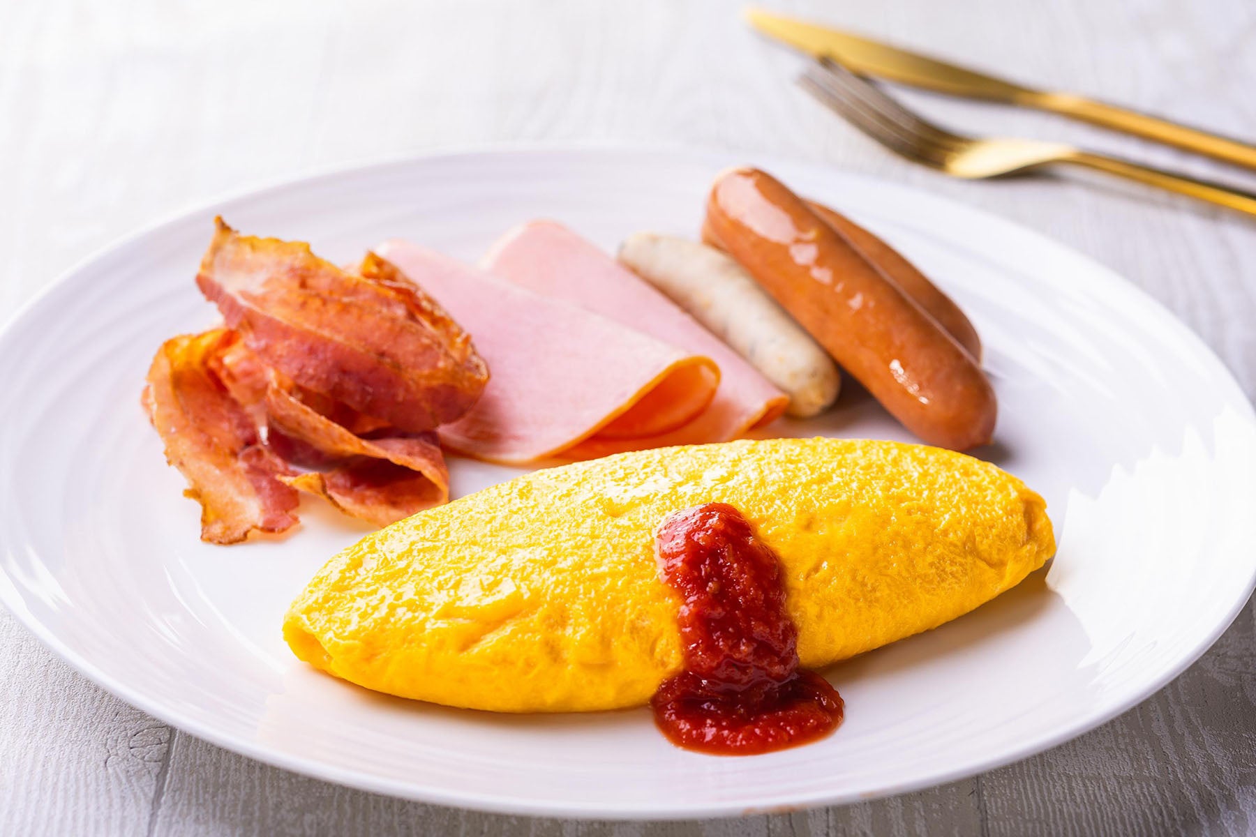 注文を受けてから一つひとつ丁寧に調理するオムレツは、ベーコンやハム、ソーセージなどの付け合わせを選び、自分好みのワンプレートとして楽しめます。毎朝焼き上げるホテルメイドのパンと一緒にお召し上がりください。