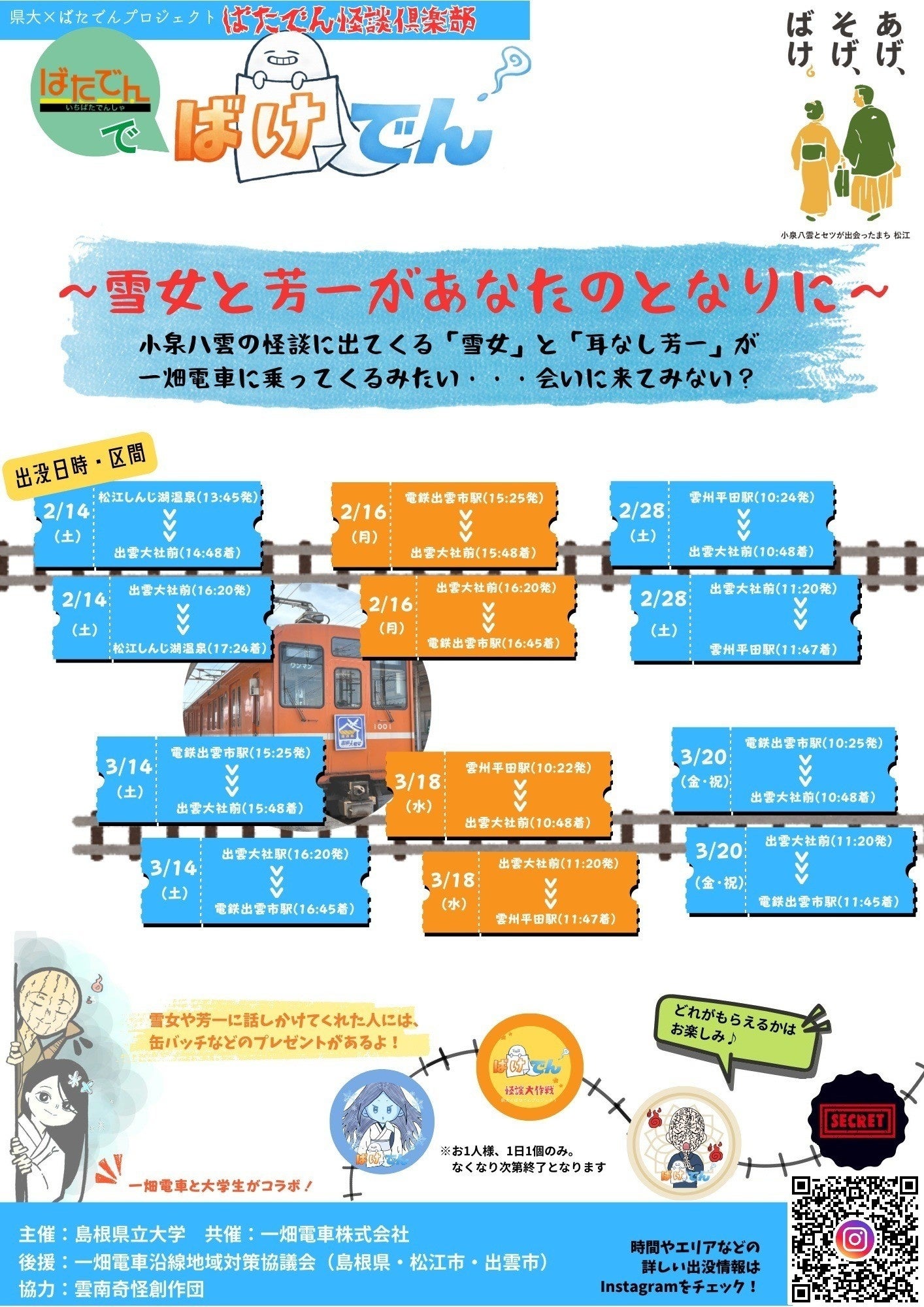 2026年2月から3月にかけて、島根県立大学松江キャンパスの学生が「雪女」、「耳なし芳一」に扮して一畑電車に乗り込み、演劇的な手法を交えながら利用客と交流を図ります。(詳細はチラシを参照ください)
