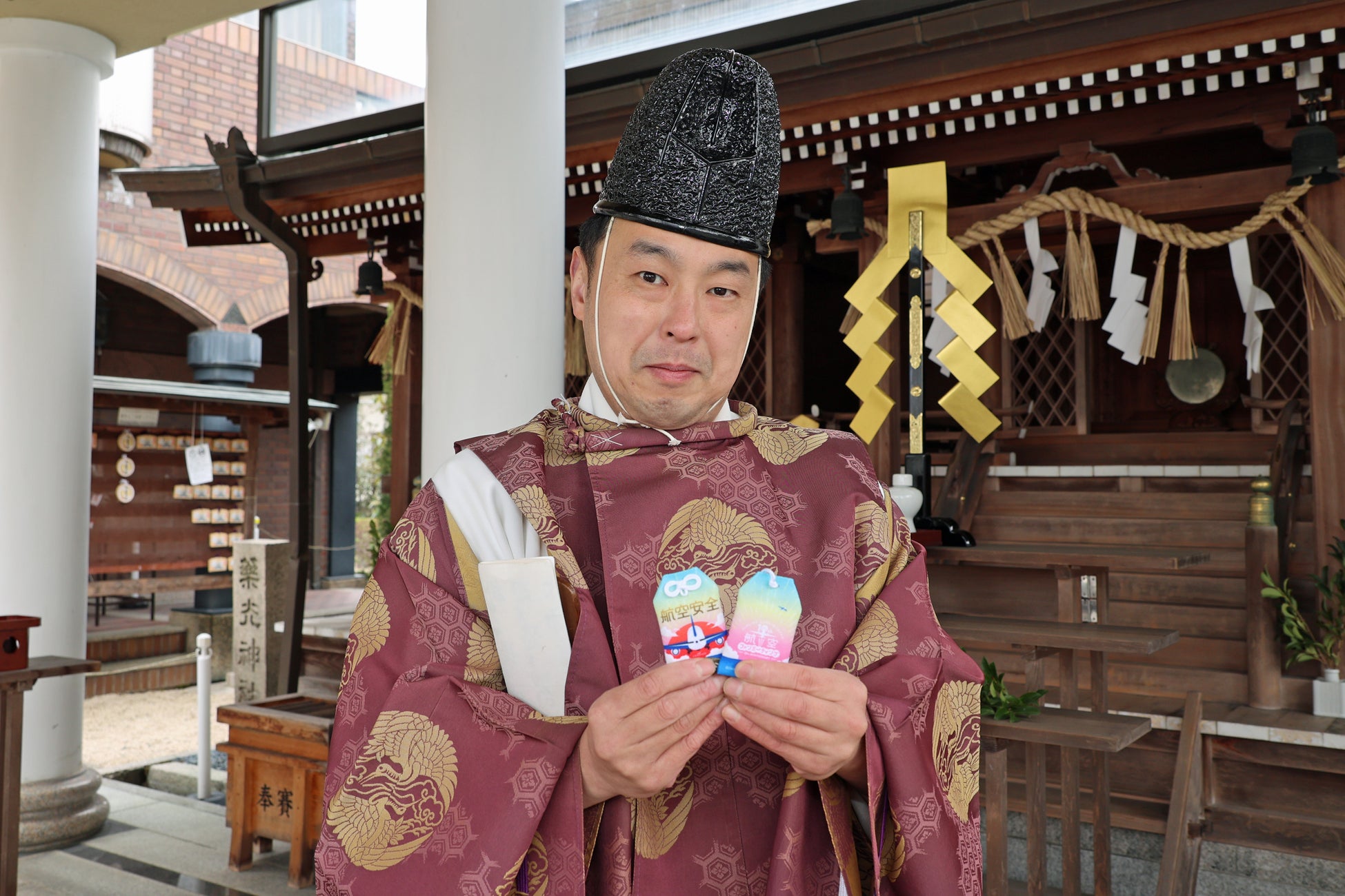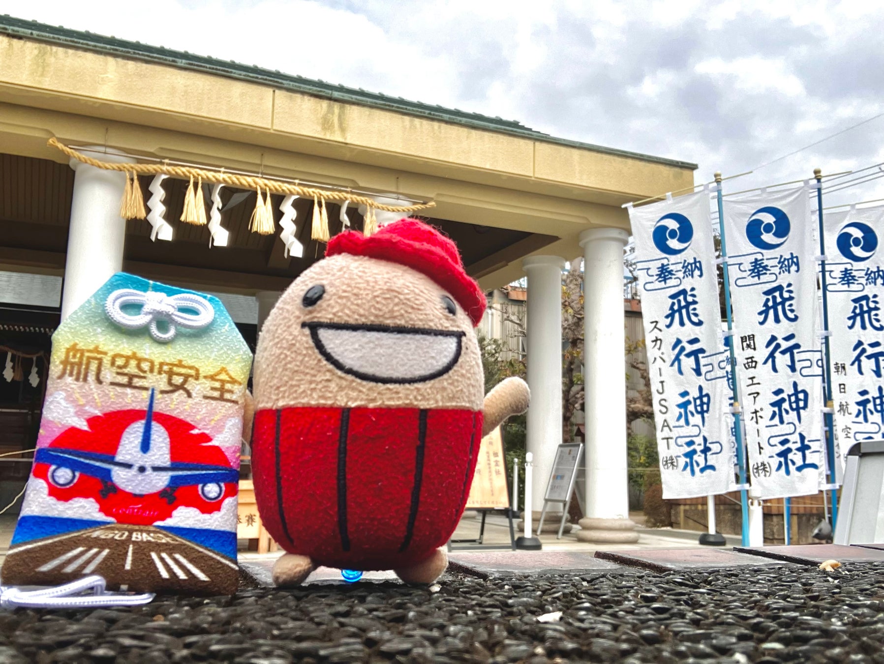 今年販売する航空安全お守りのご祈祷を受けるため、2月10日(火)、担当者が京都府八幡市の飛行神社を参拝、お守りを持参して祈願していただきました。